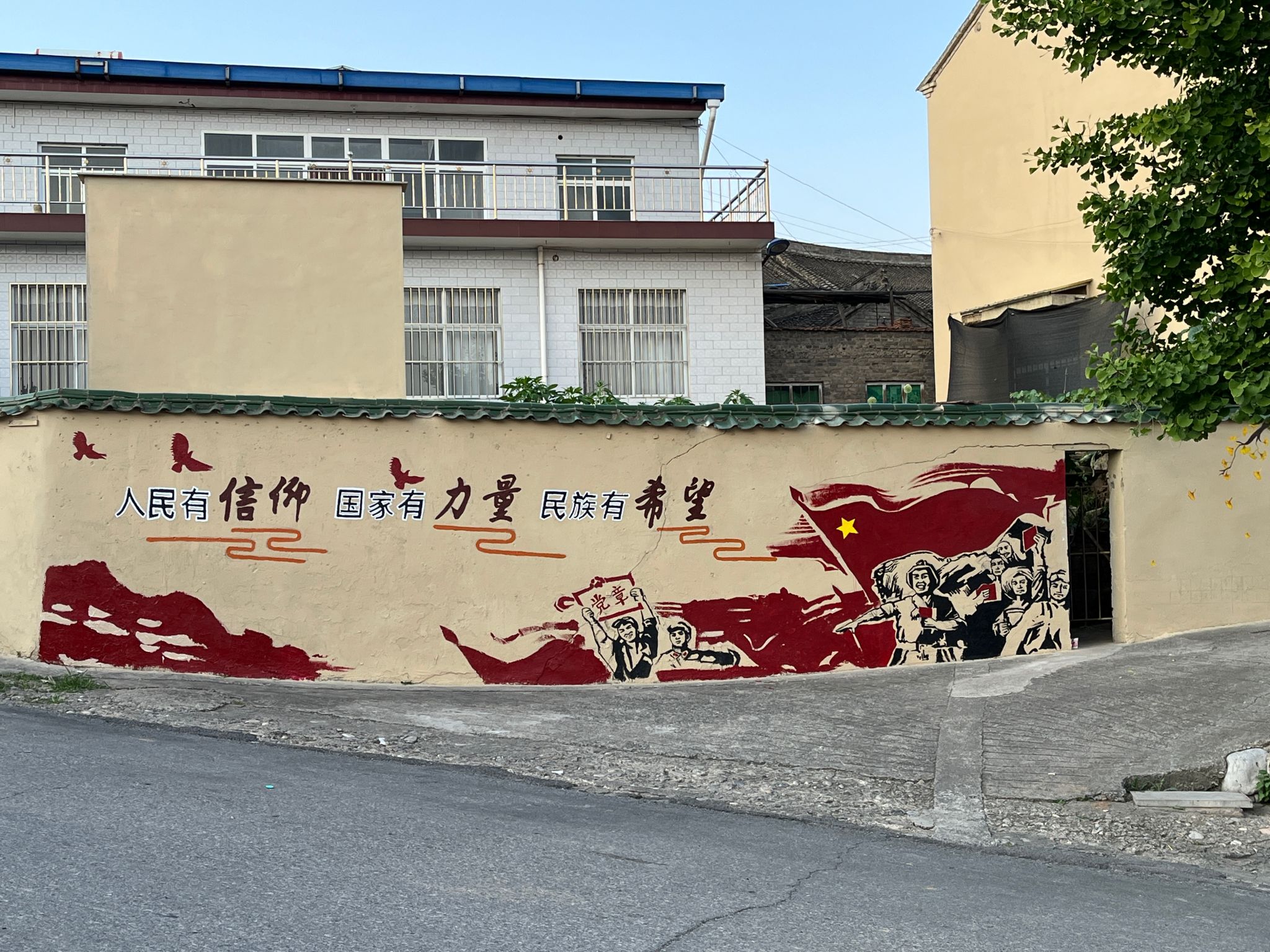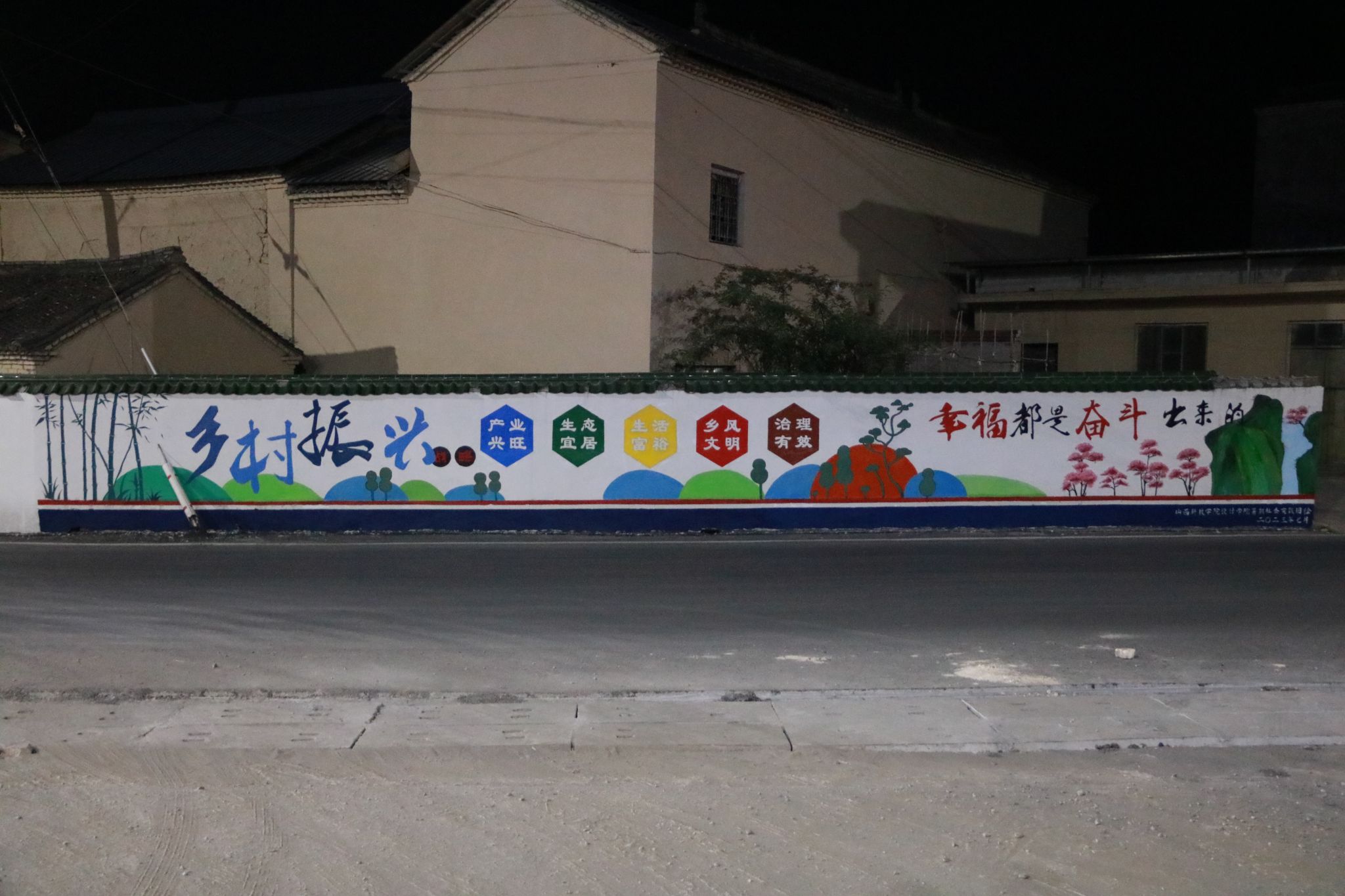 习近平总书记强调,要“教育引导青年学生树立家国情怀,奉献新时代,了解乡村风貌和发展状况,用所知所学服务家乡、服务人民,助力国家乡村振兴战略”。在指导教师郭泽亮和司晓琪的带领下,“匠心筑梦”实践团秉持“手执爱国之笔,助力乡村振兴”的实践理念,量尺寸、定主题、打线稿、上颜色、抠细节,不惧高温酷暑,齐心协力、团结合作,共完成14幅作品、220余平方米的墙面绘制。实践团队用充满活力的色彩搭配、创意十足的彩绘设计,创作出一幅幅新时代新农村的新风貌,成为了提升当地主干道文化内涵的新亮点,赢得当地村民的高度赞赏。