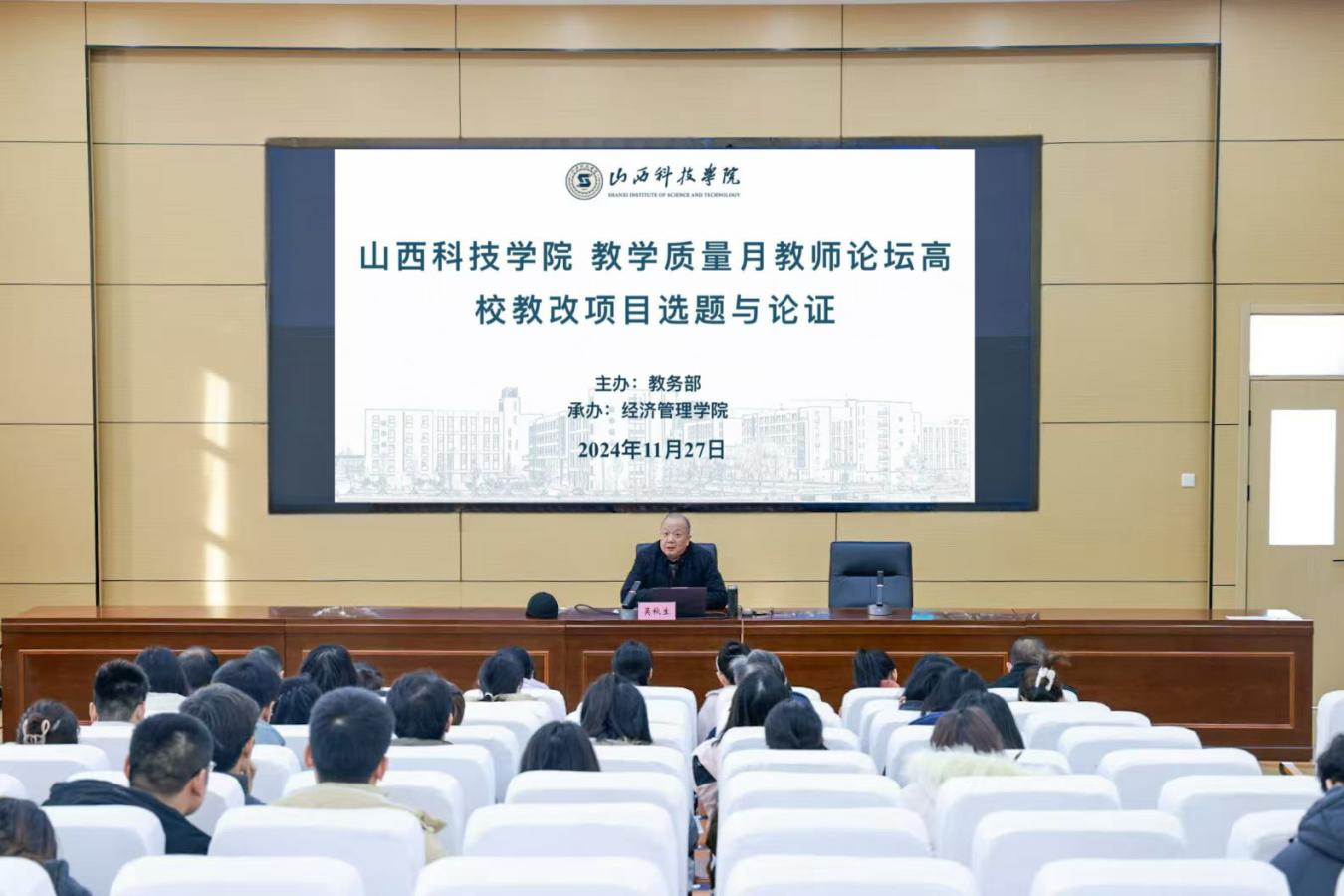 11月27日上午,山西财经大学会计学院院长吴秋生教授应邀在图书馆报告厅为Beat365官网教师作《高校教改项目选题与论证》专题讲座,全体教研室主任及各学院教师代表参加。
