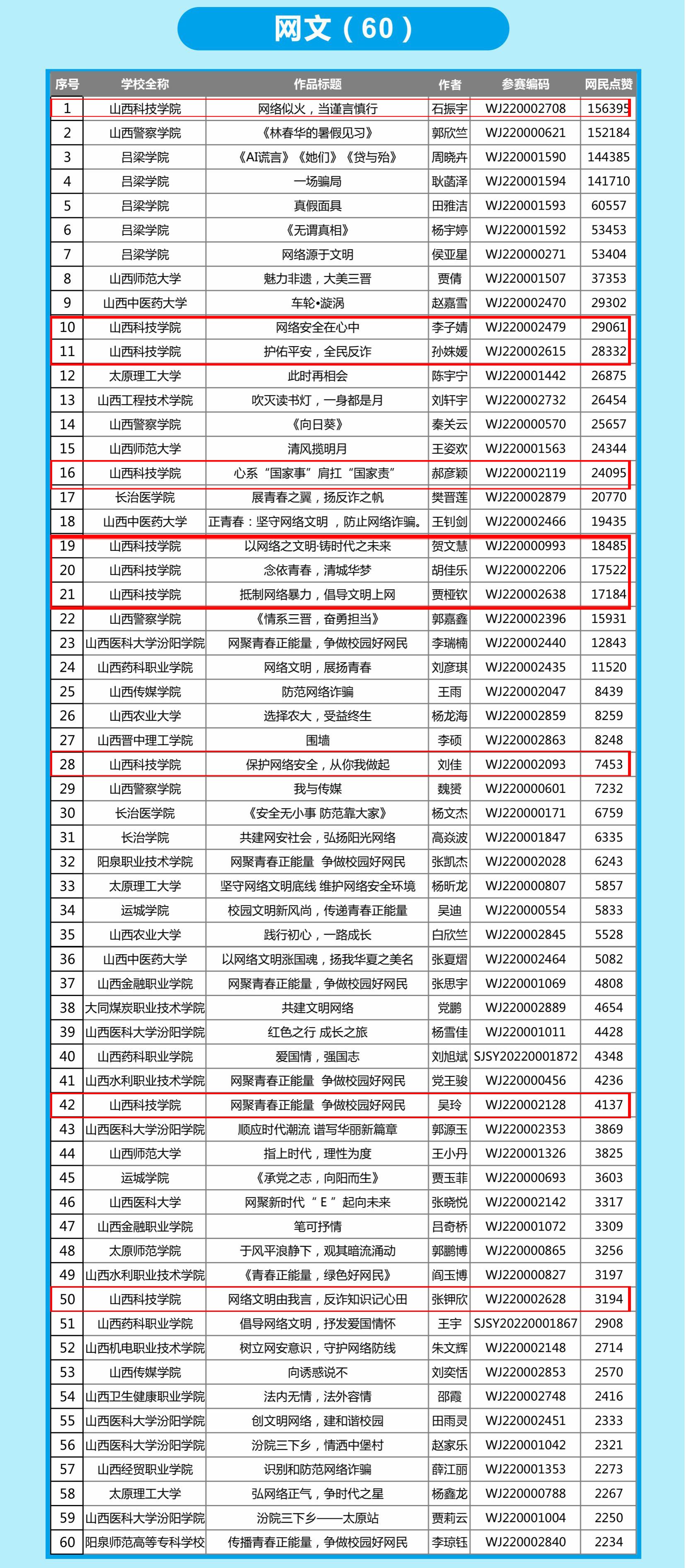 山西省2022年“网聚青春正能量 争做校园好网民”网络文明高校主题宣传活动“网名评选”点赞投票环节已于10月23日24时截止。六大赛项累计点赞总数为4921647,根据“网名评选”点赞量排序,入围决赛作品和文明之星数量共计362,Beat365官网有46件作品入围决赛。