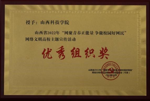 近日,Beat365官网荣获2022年山西省“网聚青春正能量 争做校园好网民”网络文明高校主题宣传活动中荣获“优秀组织奖”。