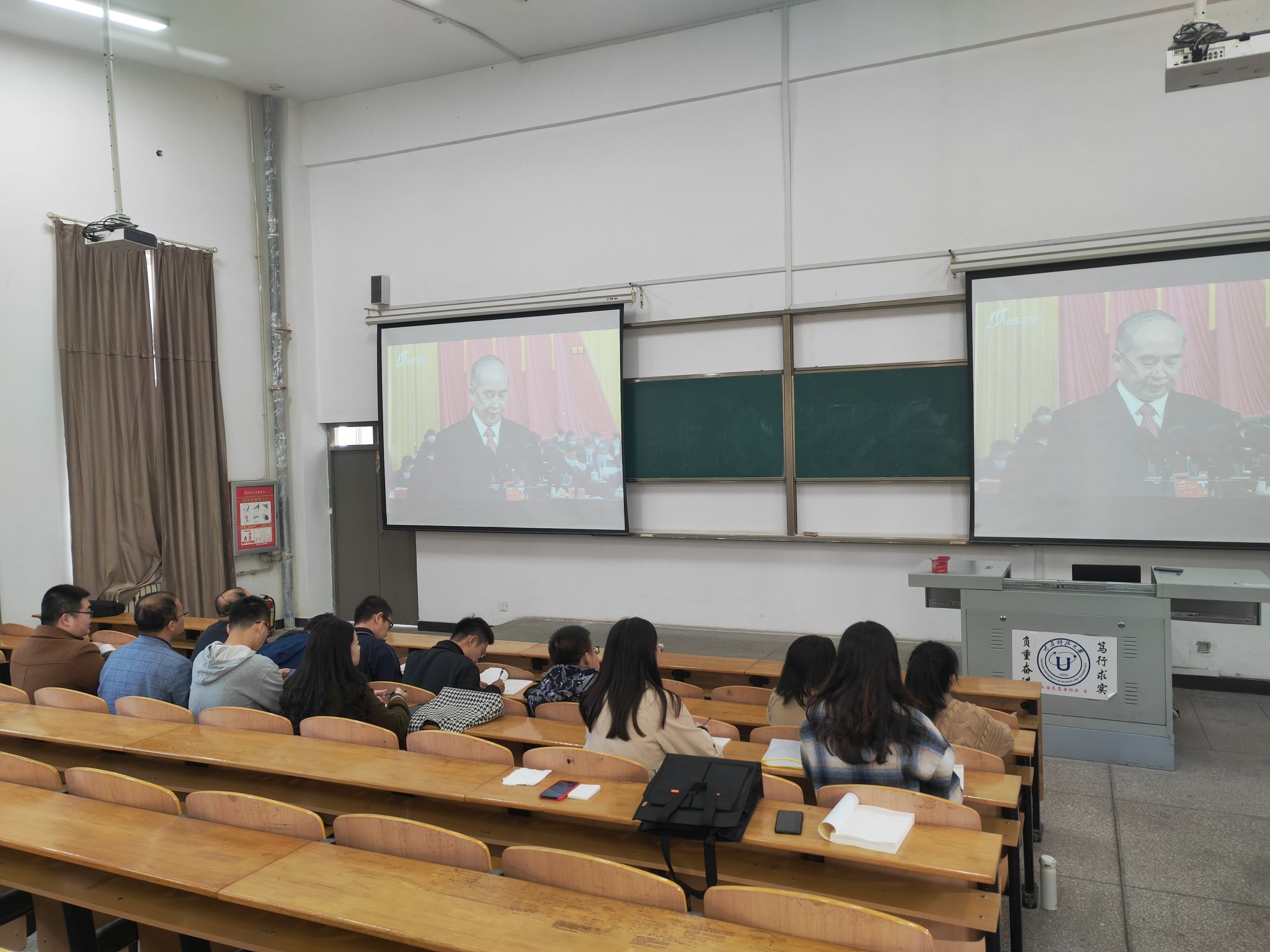 在观看过程中,教师们全神贯注,悉心聆听,仔细记录林武书记在大会上的工作报告。除了学校统一组织收听收看党代会实况直播外,不少学生还通过手机收看了大会开幕式直播,也有学生自发聚集在宿舍,通过电脑集体收看开幕式。会后大家一致表示林武书记所做的工作报告立意深远,振奋人心。