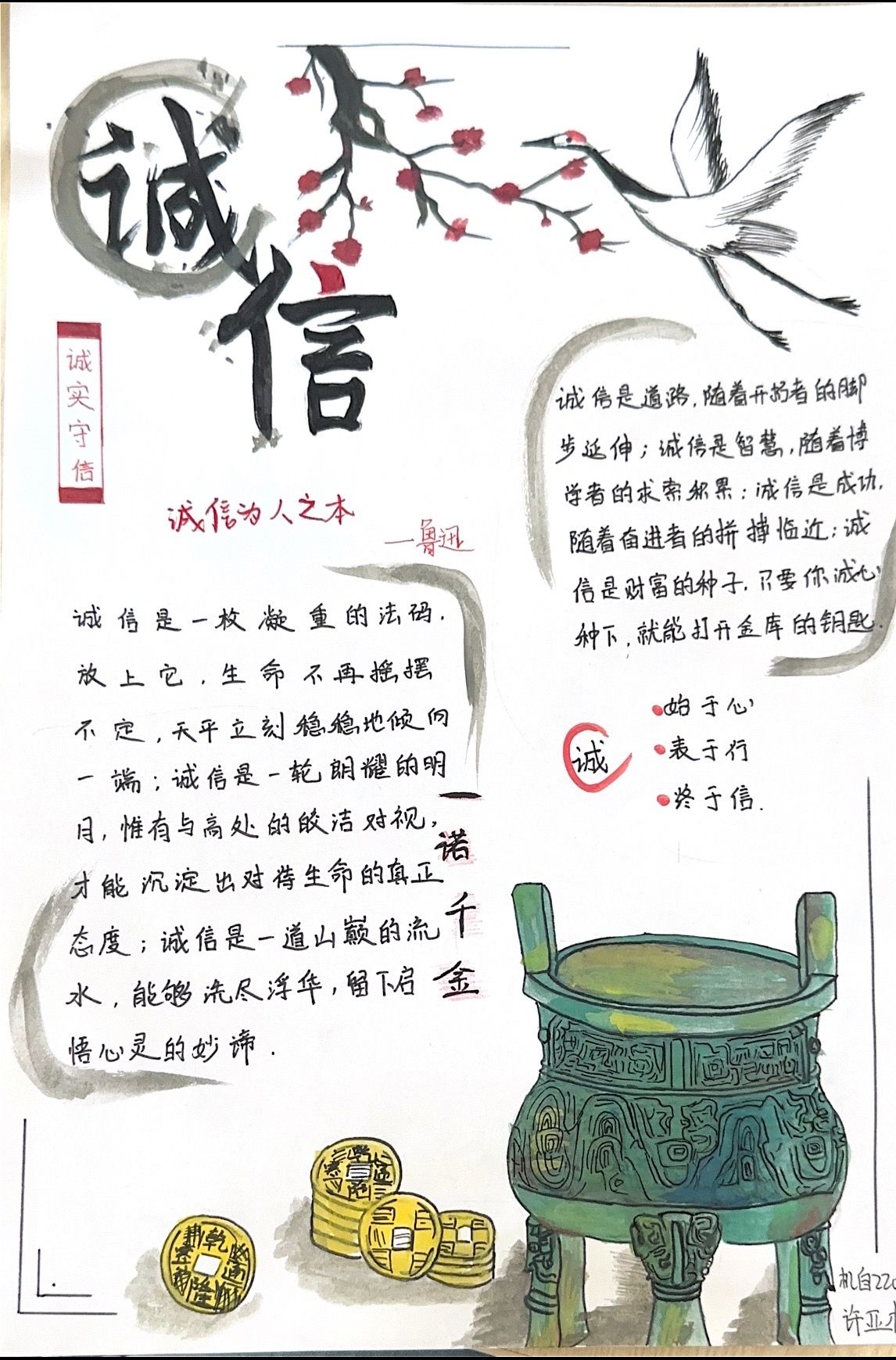 为进一步宣传诚信知识,树立学生诚信意识,学校举办“诚以修身,信以立德”主题手绘活动。参与学生紧紧围绕活动主题,创作出一幅幅图文并茂,色彩丰富、风格各异的优秀作品,充分展示同学们对诚信的认知与对诚信资助的感恩与理解。本项活动参与人数众多,影响较大,为后续活动开展营造了良好的诚信育人氛围。