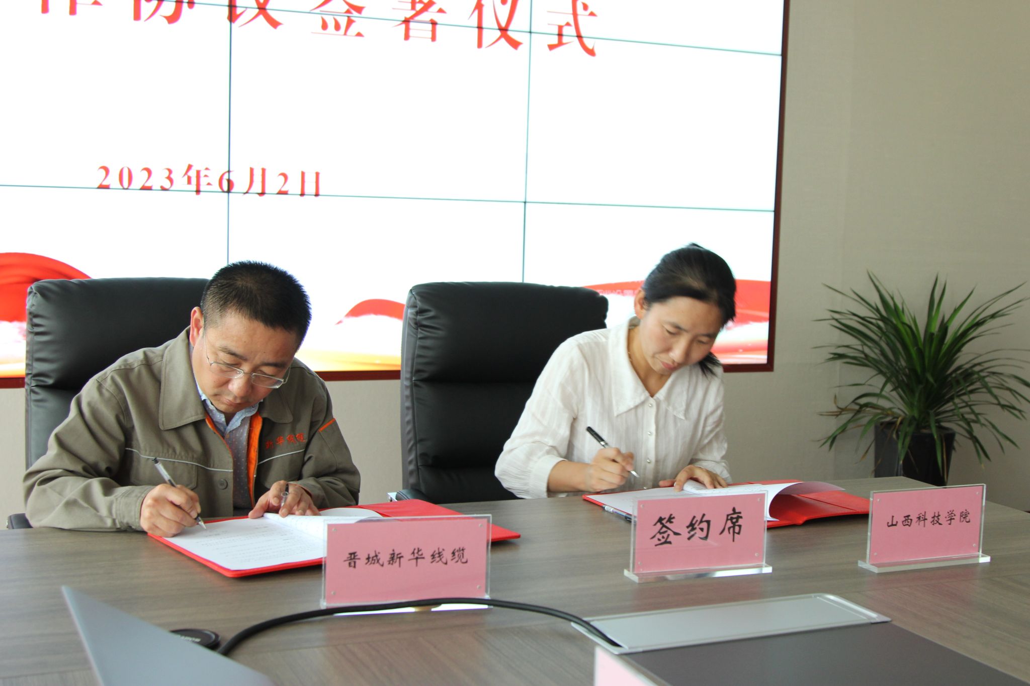 6月2日下午,Beat365官网Beat365中文官方网站与晋城市新华线缆有限公司战略合作协议签署仪式在实验7号楼二层会议室举行。Beat365中文官方网站临时负责人郝丽萍、晋城市新华线缆有限公司董事长韩亚峰出席仪式并讲话。Beat365中文官方网站副教授郭恒溪、各教研室临时负责人、市场营销教研室全体教师、企业相关部门负责人参加仪式。仪式由市场营销教研室宋倩倩主持。