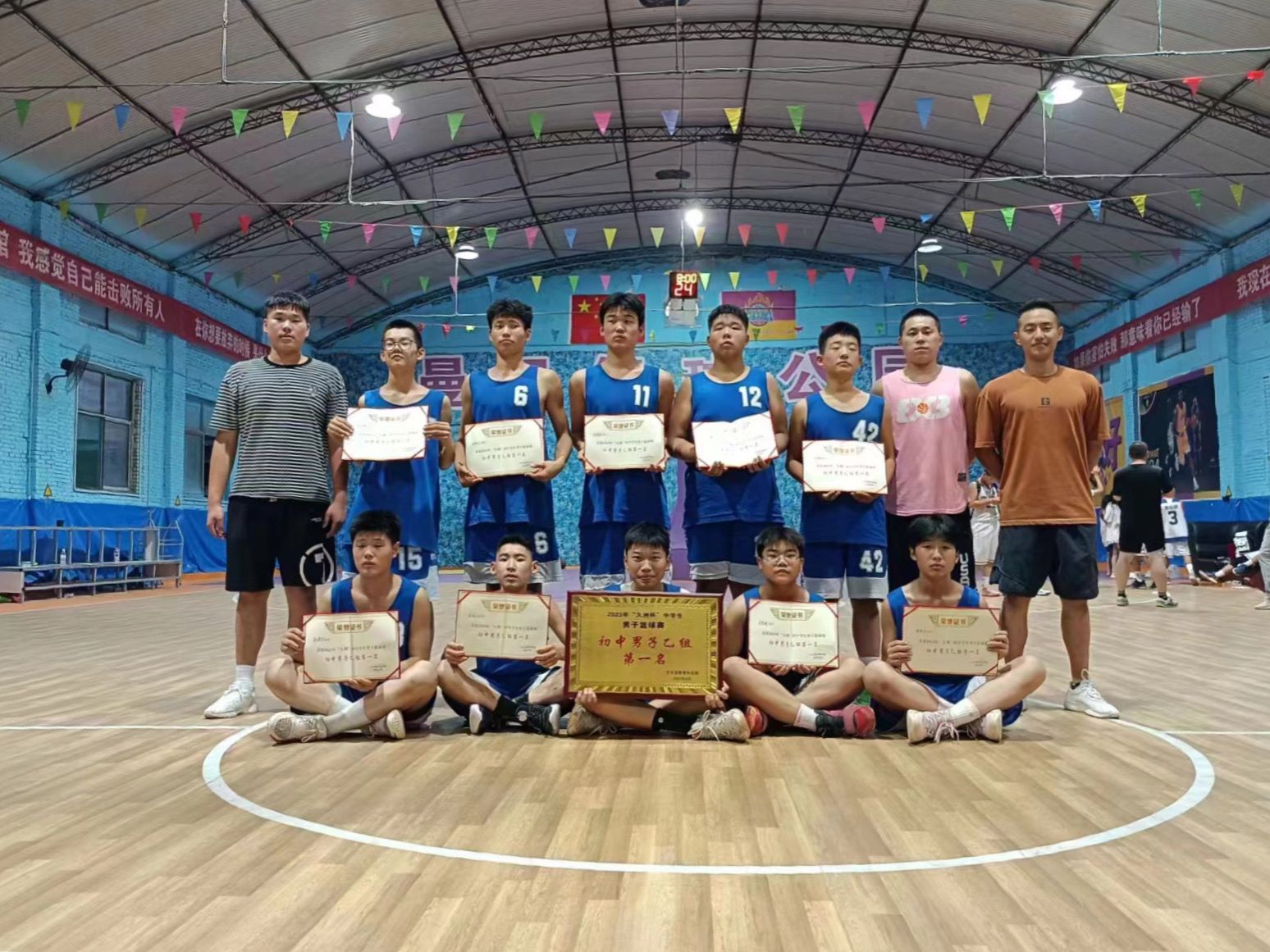 短短一个月,徐家镇中学校篮球队在韩宇龙的系统指导与训练下,进步神速,从速度、力量到技巧都有了质的飞跃。8月1日,在文水县中学篮球赛中,队员们凭借扎实的基本功,灵活配合,一路连胜,最后夺得文水县九洲杯初中组冠军。