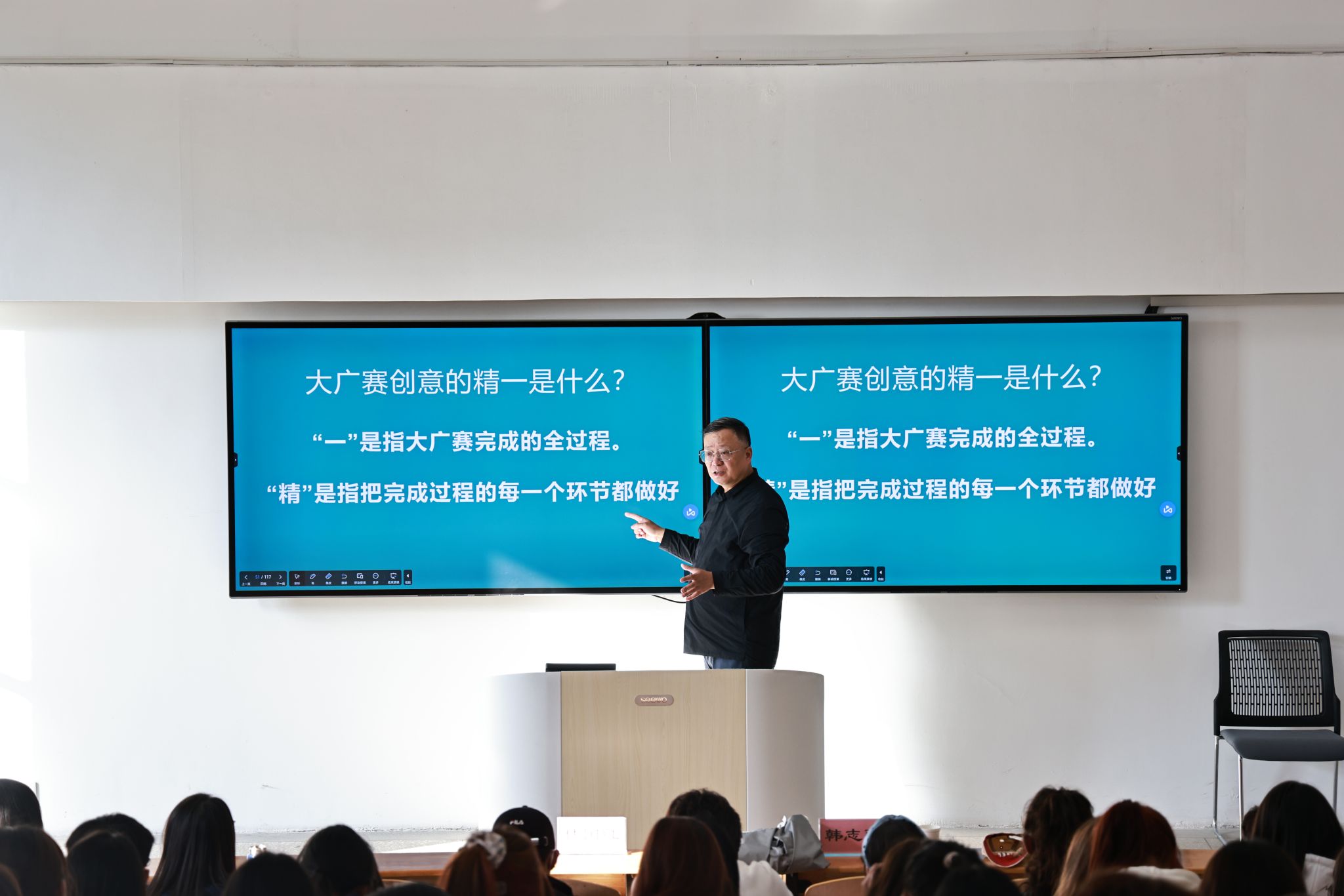韩志强从时光与厚重、文化与积累的角度,阐释“创意为改变”和“设计为未来”的理念,将“惟精惟一”这一思路引入“大广赛”创意过程,启发大家在创意设计中“精”于每一个步骤从而完成好整体的“一”。韩教授把多年来的创意设计经验总结成为《创意三字经》,从“道、法、术、规”四部分透彻地分析了什么是好的创意、如何做好的创意以及要把广告做成规制下的精彩等。韩志强与现场同学就学习方法、就业方向等问题进行了热烈交流,为同学们未来4年的专业课学习、大广赛、实践项目提出了建议,指明了方向。