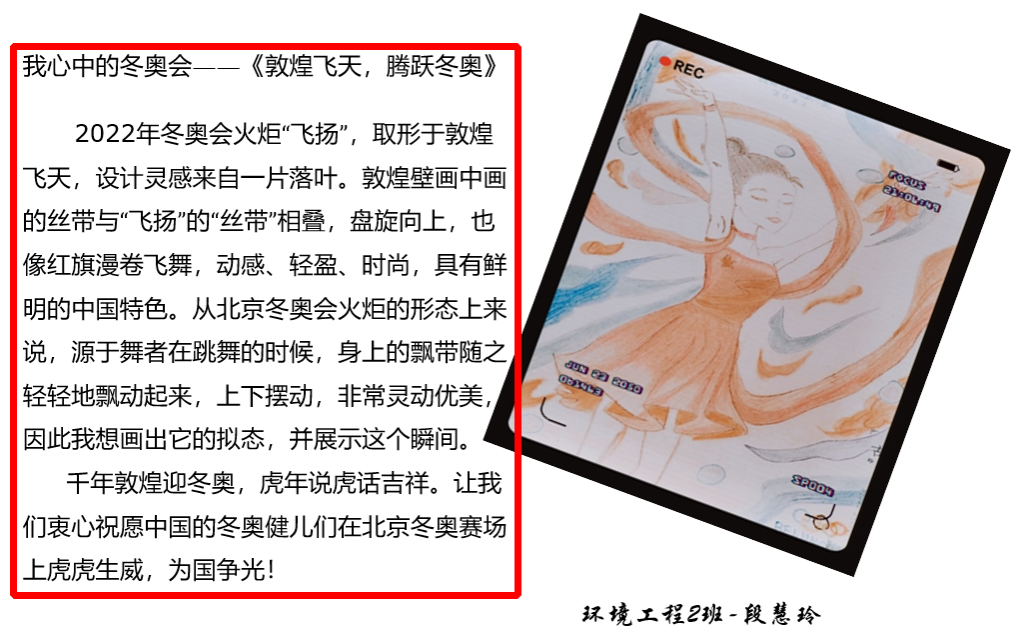 段慧玲同学从北京冬奥会火炬的形态着手制作《敦煌飞天,腾跃冬奥》,画中舞者在跳舞,身上的飘带随之轻轻地飘动起来,上下摆动,灵动优美。千年敦煌迎冬奥,虎年说虎话吉祥,用中国特色文化形式表达出“冬奥会的举办不仅仅是让世界了解冰雪运动,更是让世界认识中国”!