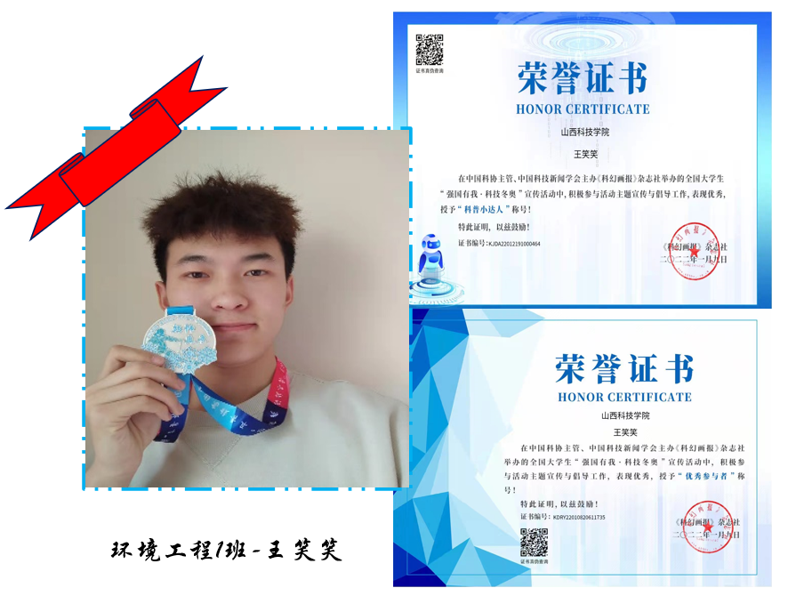 王笑笑同学参加《科幻画报》杂志社举办的全国大学生“强国有我 科技冬奥”宣传活动,并获得“优秀参与者”和《科普小达人》称号!