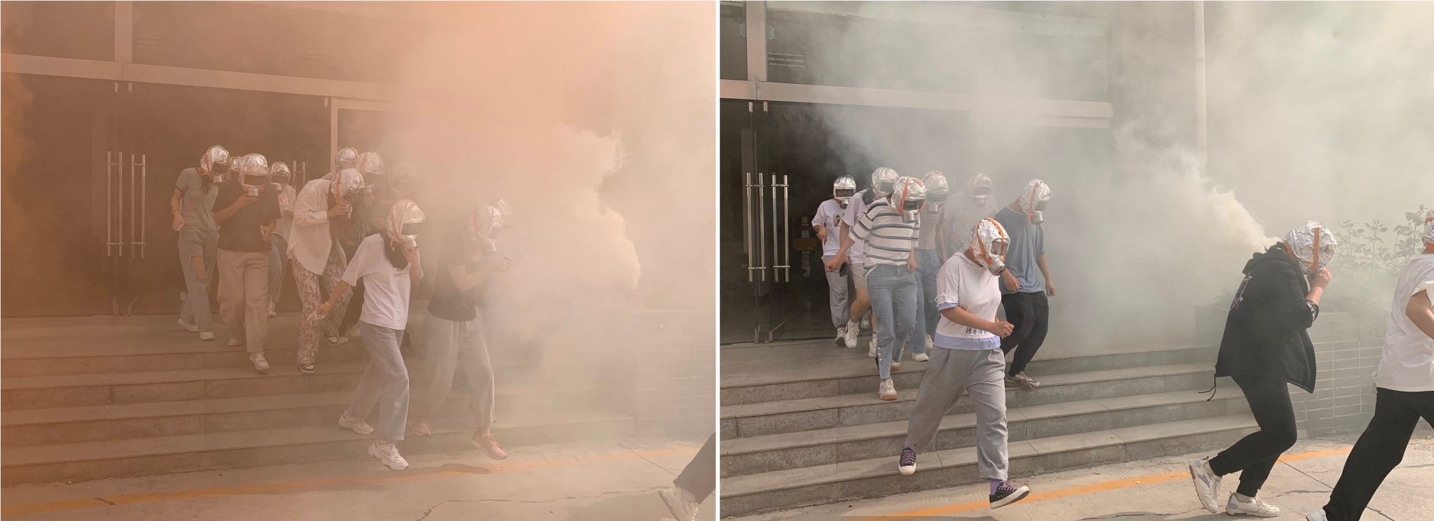 讲座结束,伴随着急促的警报声响起,大家立刻有序疏散,全体参演人员佩戴面罩、低头弯腰,不惊慌、听指挥、动作敏捷、无推挤、无冲撞地安全逃生,整个疏散演练过程安全、快速、有序、高效,不到一分钟,所有人员撤离完毕并到达指定安全场地。