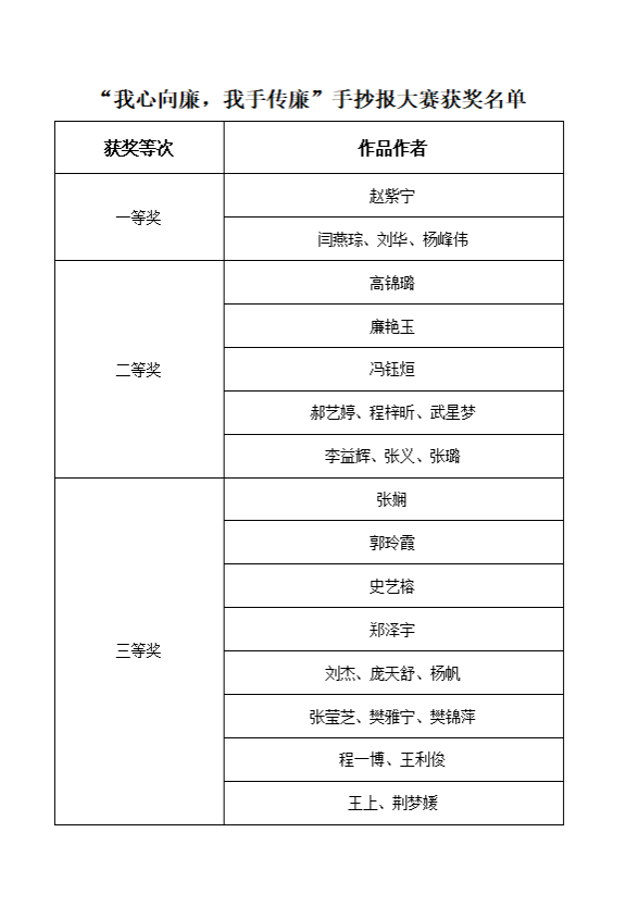 “我心向廉,我手传廉”手抄报大赛经过层层筛选、优中选优,评奖结果出炉。赵紫宁等4名同学的两幅作品获一等奖,高锦璐等9名同学的五幅作品获二等奖,张娴等14名同学的八幅作品获三等奖,权芙蓉等34名同学的二十幅作品获优秀奖。产品设计专业2021级1班团支部、化学工程与工艺专业2021级1班团支部、通信工程专业2021级2班团支部、机械设计制造及其自动化专业2021级2班团支部、安全工程专业2021级4班团支部、环境设计专业2021级1班团支部共6个团支部获优秀组织奖。