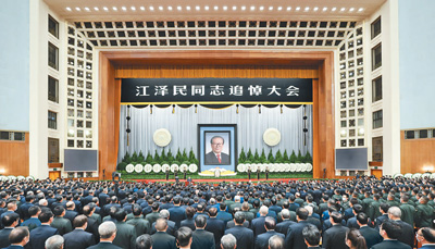 今天,全国下半旗志哀,停止一切公共娱乐活动。追悼大会在人民大会堂大礼堂举行。会场庄严肃穆。主席台以银灰色为底色,台口上方悬挂黑底白字横幅:“江泽民同志追悼大会”。主席台正中悬挂着江泽民同志的巨幅彩色遗像。江泽民同志的骨灰盒安放在遗像前的鲜花翠柏丛中,骨灰盒上覆盖着鲜红的中国共产党党旗。江泽民同志的夫人王冶坪率全家敬献的花篮摆放在江泽民同志的骨灰盒前。6名礼兵持枪肃立,守护在两旁。
