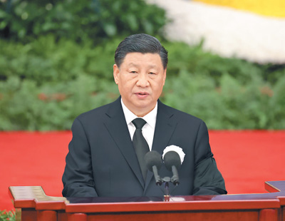 在全场凝重的气氛中,习近平致悼词。习近平在悼词中高度评价了江泽民同志光辉的一生和建立的丰功伟绩。他指出,从党的十三届四中全会到党的十六大的13年中,国际形势风云变幻,我国改革开放和社会主义现代化建设进程波澜壮阔。在国际国内十分复杂的形势下,江泽民同志带领党的中央领导集体,高举马克思列宁主义、毛泽东思想、邓小平理论伟大旗帜,坚持党的基本路线不动摇,紧紧依靠全党全军全国各族人民,坚定不移坚持和发展中国特色社会主义。江泽民同志深刻洞察世界新军事变革的发展趋势,主持制定了新时期军事战略方针,强调要推进中国特色军事变革,坚定不移走中国特色的精兵之路,加强人民军队革命化、现代化、正规化建设。在江泽民同志亲自领导和大力推动下,我国国防和军队现代化建设取得了巨大成就。江泽民同志集中全党智慧创立了“三个代表”重要思想,进一步回答了什么是社会主义、怎样建设社会主义的问题,创造性回答了建设什么样的党、怎样建设党的问题,深化了我们对新的时代条件下推进中国特色社会主义事业、加强党的建设的规律的认识,以新的思想、观点、论断,继承、丰富、发展了马克思列宁主义、毛泽东思想、邓小平理论。