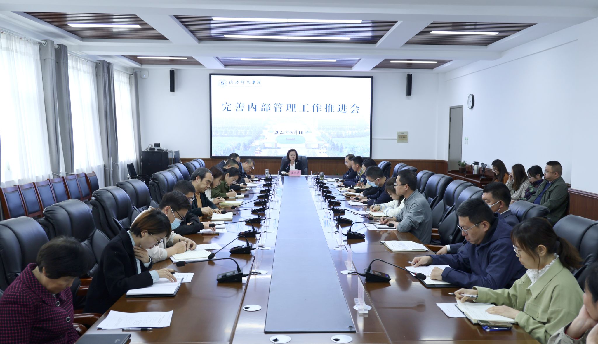 梁丽萍认真听取了各部门和各二级学院临时负责人的工作汇报,并就有关问题与大家进行了深入交流,指出内部管理是现代大学制度的重要方面,是依法治校、科学管理的重要举措,是推动学校章程、“十四五”事业规划各项任务落实落地的有力保障。就完善内部管理工作,梁丽萍强调四点意见。一要提高认识,提高站位,提高标准。要充分认识到内部管理是一项长期的系统工作,是各部门、二级学院的共同责任,各单位要抓重点、补短板、强弱项,推动学校内部管理各项举措落实、落细、落到位,推动学校管理水平再提升,为学校高质量发展提供有力保障。二要健全制度,完善制度,执行制度。要加强制度建设,明确各部门、二级学院工作职责,构建完善的制度体系,提升管理水平;要梳理已有制度,及时修订制度,定期整理制度,分类汇编成册,确保制度上墙上网更上心;要严格落实制度,强化制度意识,提高制度执行力。三要严格程序,严格规范,严格要求。要进一步规范办文办会办事工作流程,提高工作质量和工作效率;要严格执行学校各项规章制度,形成按程序决策、按政策办事、按制度管事的自觉行为;要严守工作纪律,坚持高标准严要求,不越红线不触底线,确保各项工作依规依纪依法落实到位。四要优化流程,强化协调,保持弹性。要优化办事流程,提高办公信息化水平,尽快推动OA办公系统投入使用,提升服务质量,提高办事效率,提升工作效能;要加强协调联动,形成部门与部门之间、学院与学院之间、部门与学院之间的工作合力,围绕学校年度目标任务,把握时间节点,责任分解到人,全力推进各项重点工作;要善于复盘总结,提高学习、感悟、反思的能力,举一反三,触类旁通,注重提炼工作经验,形成工作亮点,打造工作品牌。