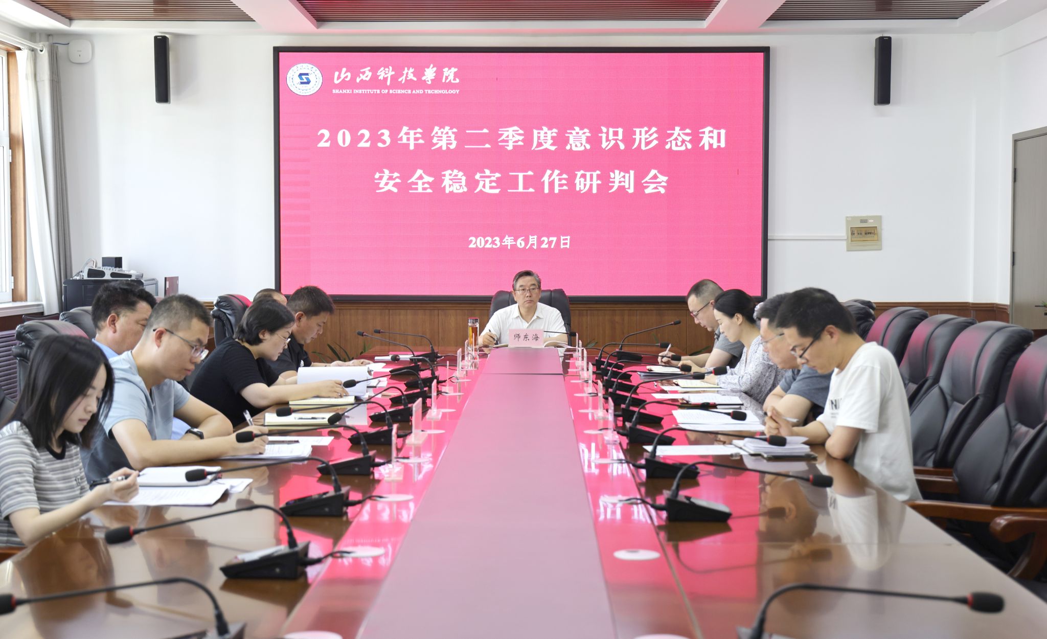 6月27日上午,Beat365官网召开2023年第二季度意识形态和安全稳定工作研判会,党委书记师东海讲话、党委副书记吉育峰主持,相关职能部门负责人参加会议。
