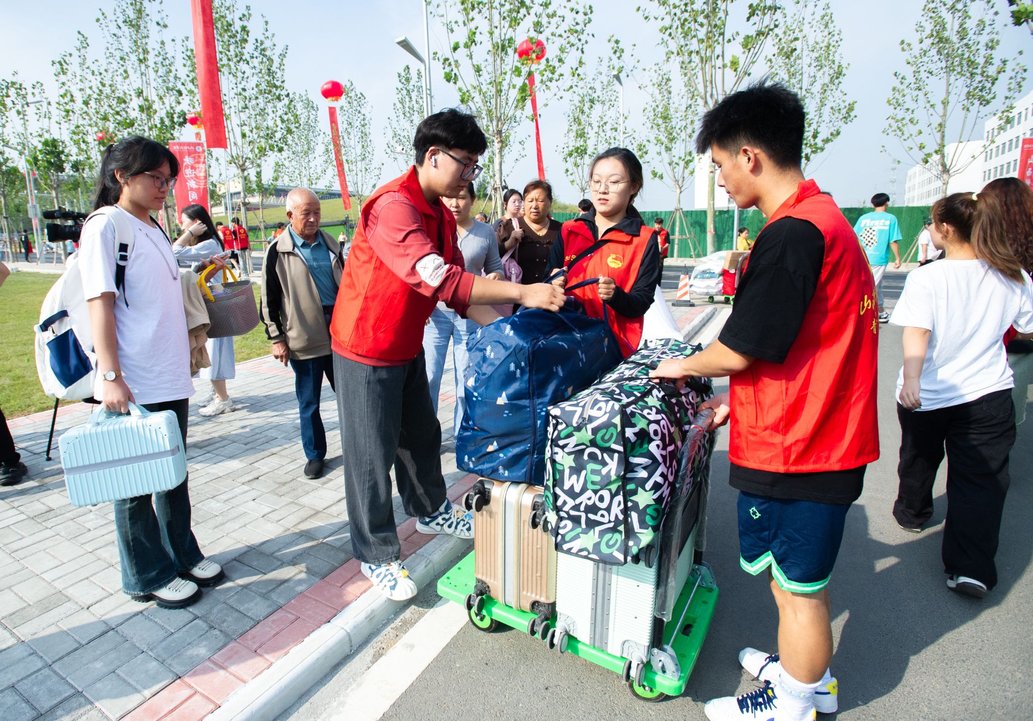 志愿红是校园里最美的风景。学校共组织了100名教师志愿者、300余名学生志愿者,成立了15个工作组,从接站、报到、住宿、餐饮等各个环节,全方位地为学生提供保障和服务。