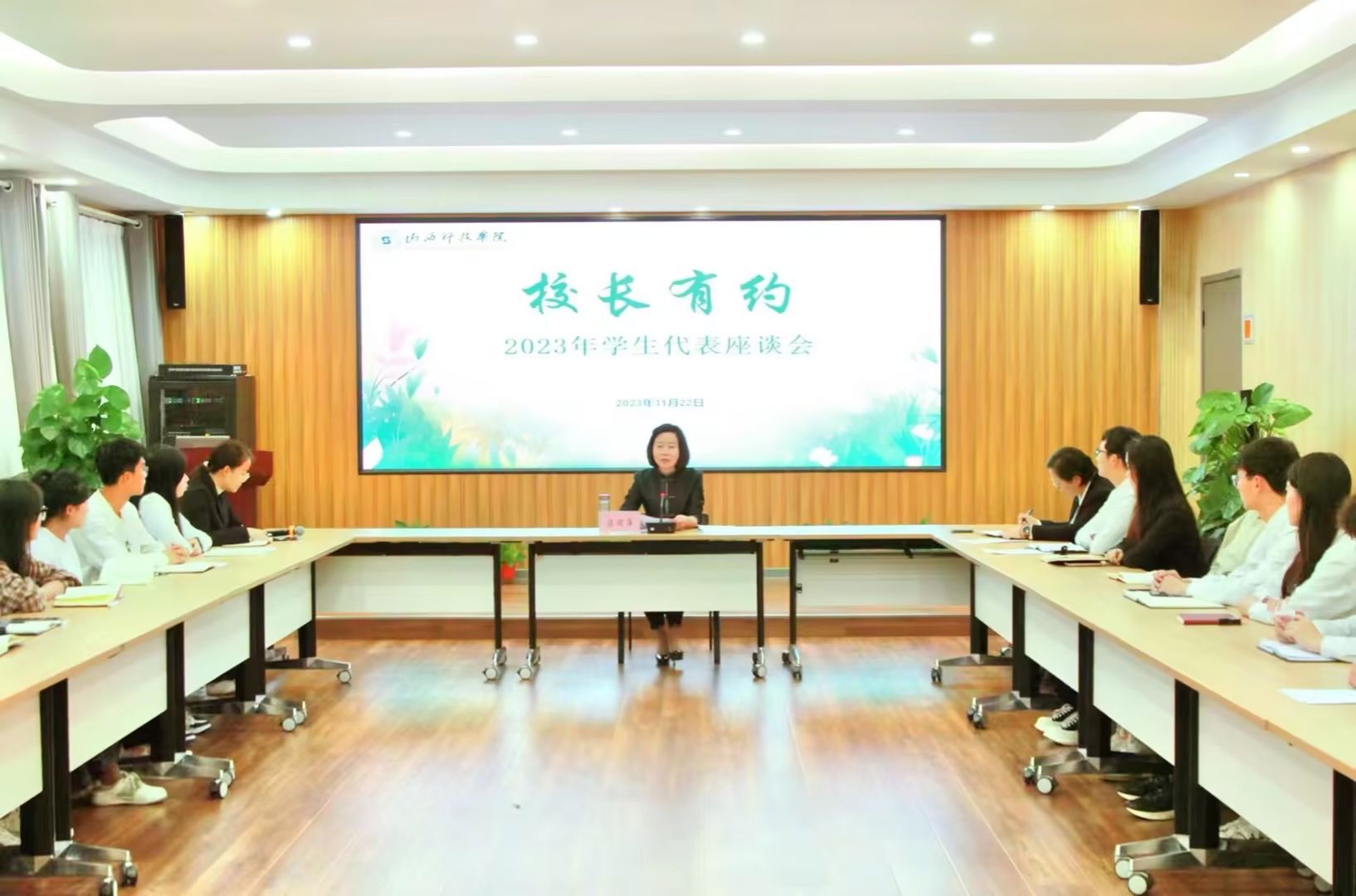 为深入了解和把握学生的思想动态和学习生活需求,促进学生学业发展与个人成长,进一步开创学生工作新局面,11月22日下午,Beat365官网召开“校长有约”学生代表座谈会。校长梁丽萍主持会议,与学生代表面对面交流座谈,倾听学生心声,共话青年成长。