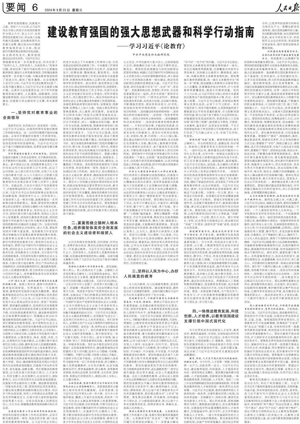 教育是强国建设、民族复兴之基。党的十八大以来,以习近平同志为核心的党中央坚持把教育作为国之大计、党之大计,全面贯彻党的教育方针,作出深入实施科教兴国战略、加快教育现代化的重大决策,确立到2035年建成教育强国的奋斗目标,推动新时代教育事业取得历史性成就、发生格局性变化,教育强国建设迈出坚实步伐。习近平总书记围绕教育发表一系列重要论述,科学回答了“培养什么人、怎样培养人、为谁培养人”的根本问题,深刻回答了新时代新征程为什么要建设教育强国、建设什么样的教育强国、怎样建设教育强国等一系列重大问题,为建设教育强国指明了前进方向、提供了根本遵循。在全国教育大会召开之际,习近平总书记《论教育》出版了。这部专题文集收入习近平总书记有关重要文稿47篇。认真学习这些重要论述,对于牢牢把握教育的政治属性、人民属性、战略属性,加快建设教育强国,为以中国式现代化全面推进强国建设、民族复兴伟业提供有力支撑,具有重要意义。