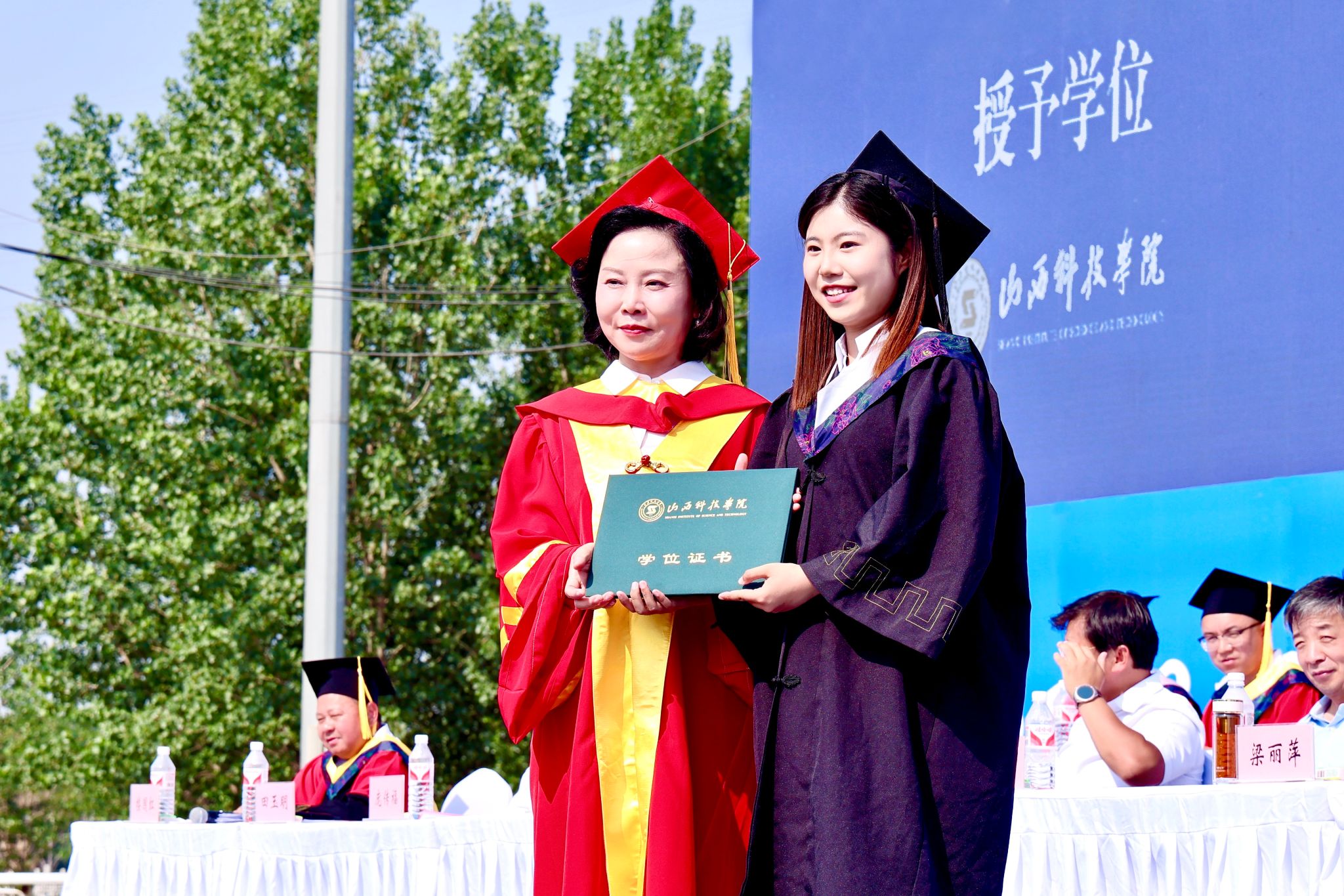 梁丽萍为优秀毕业生拨穗正冠、授予学位。