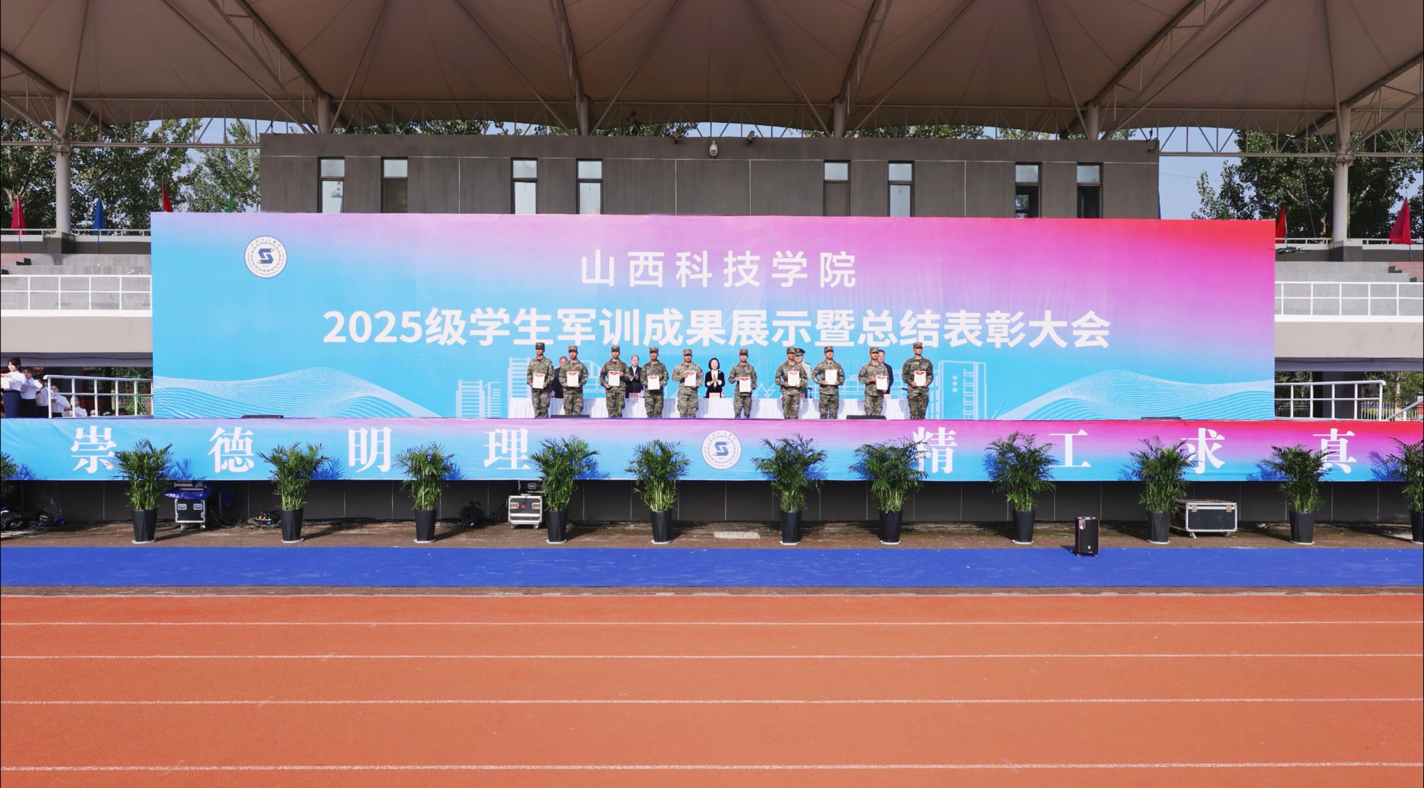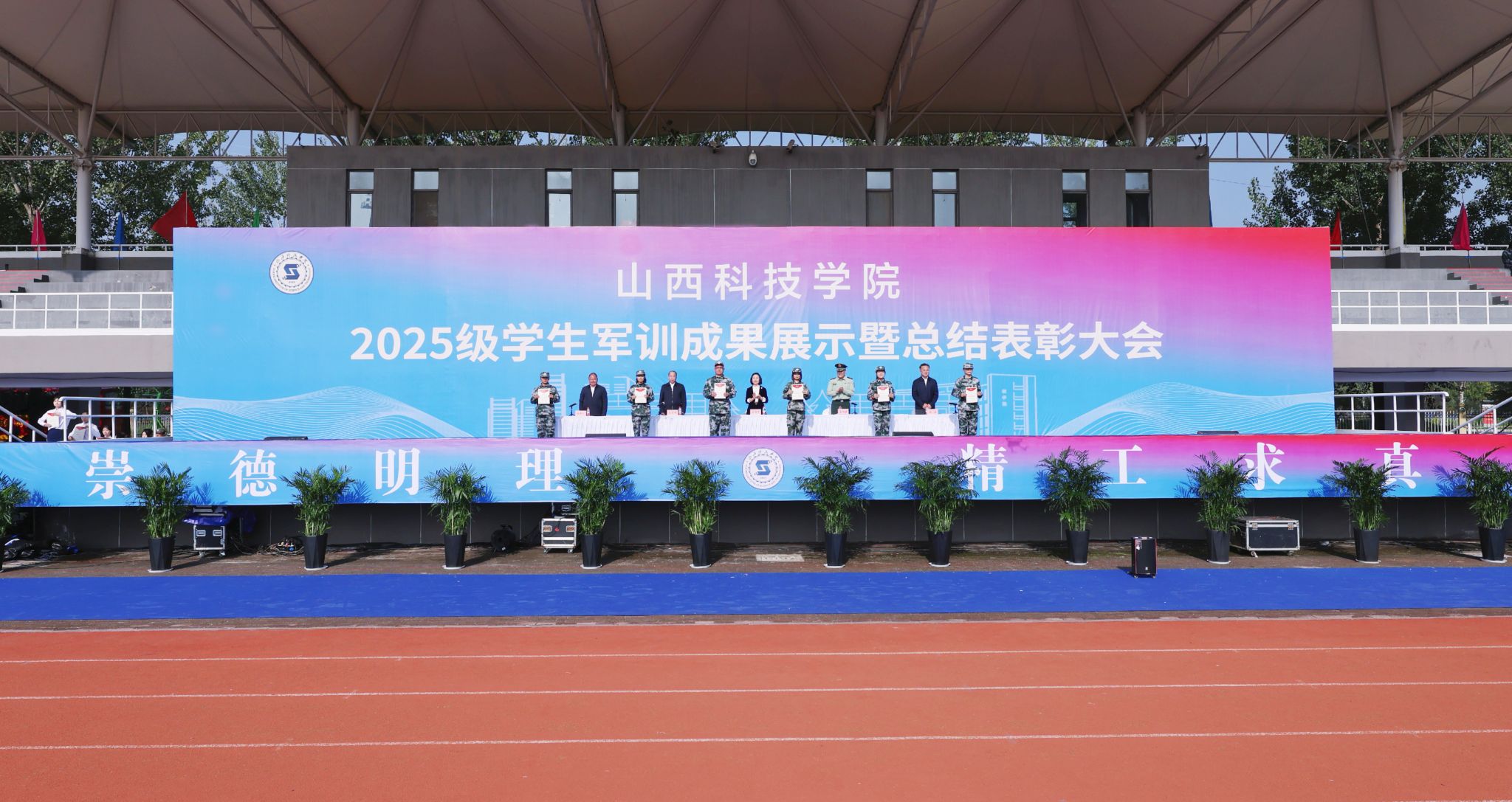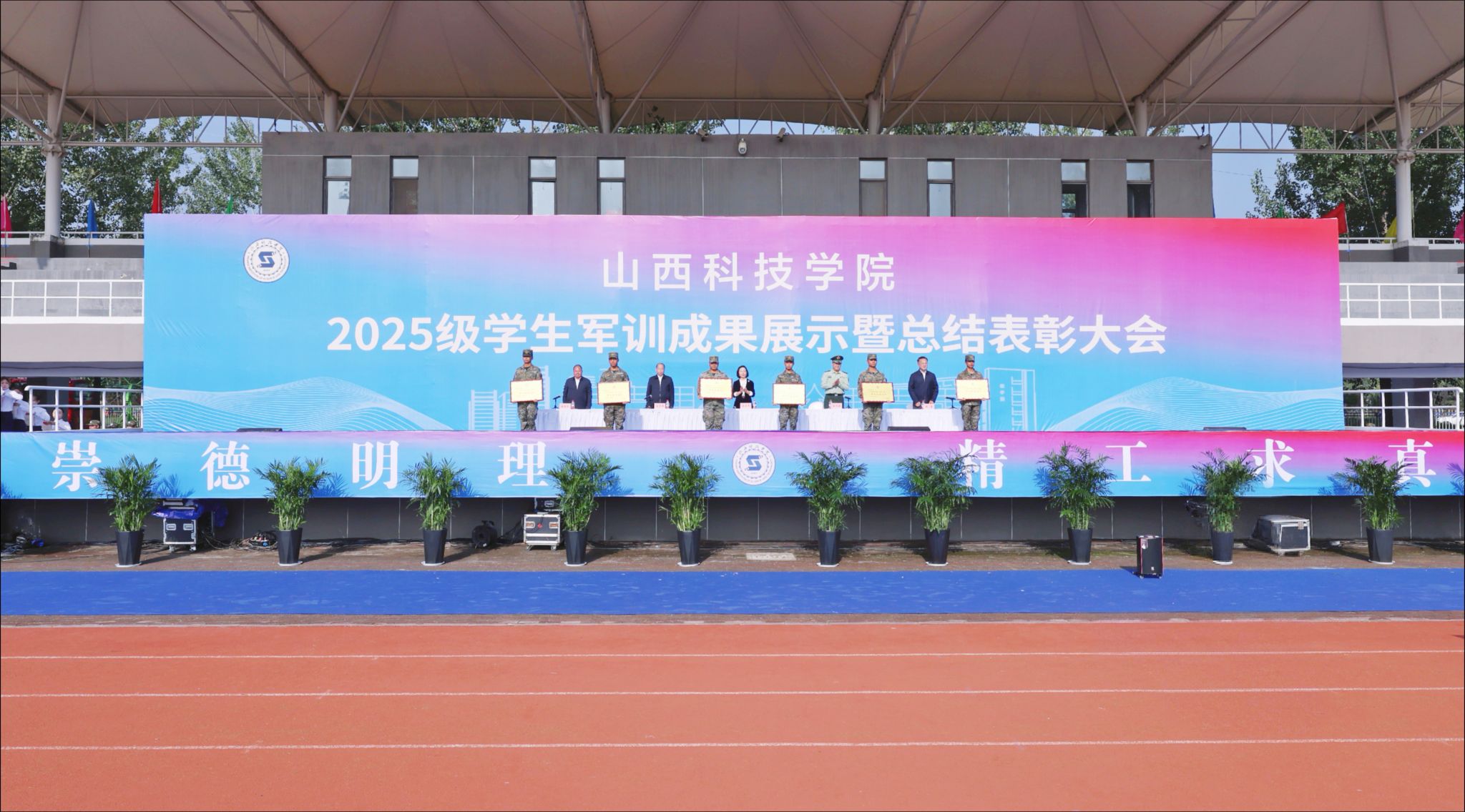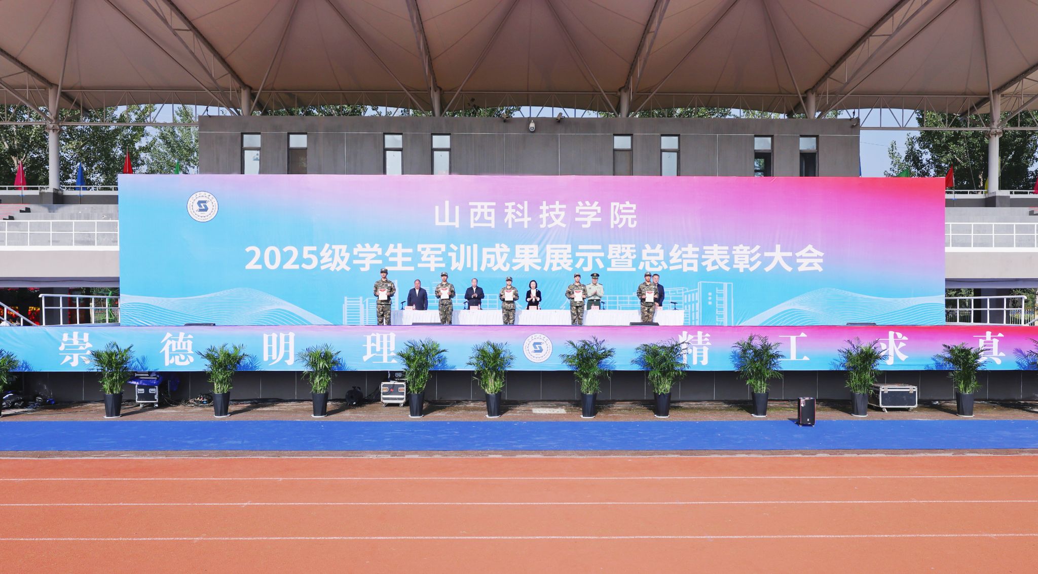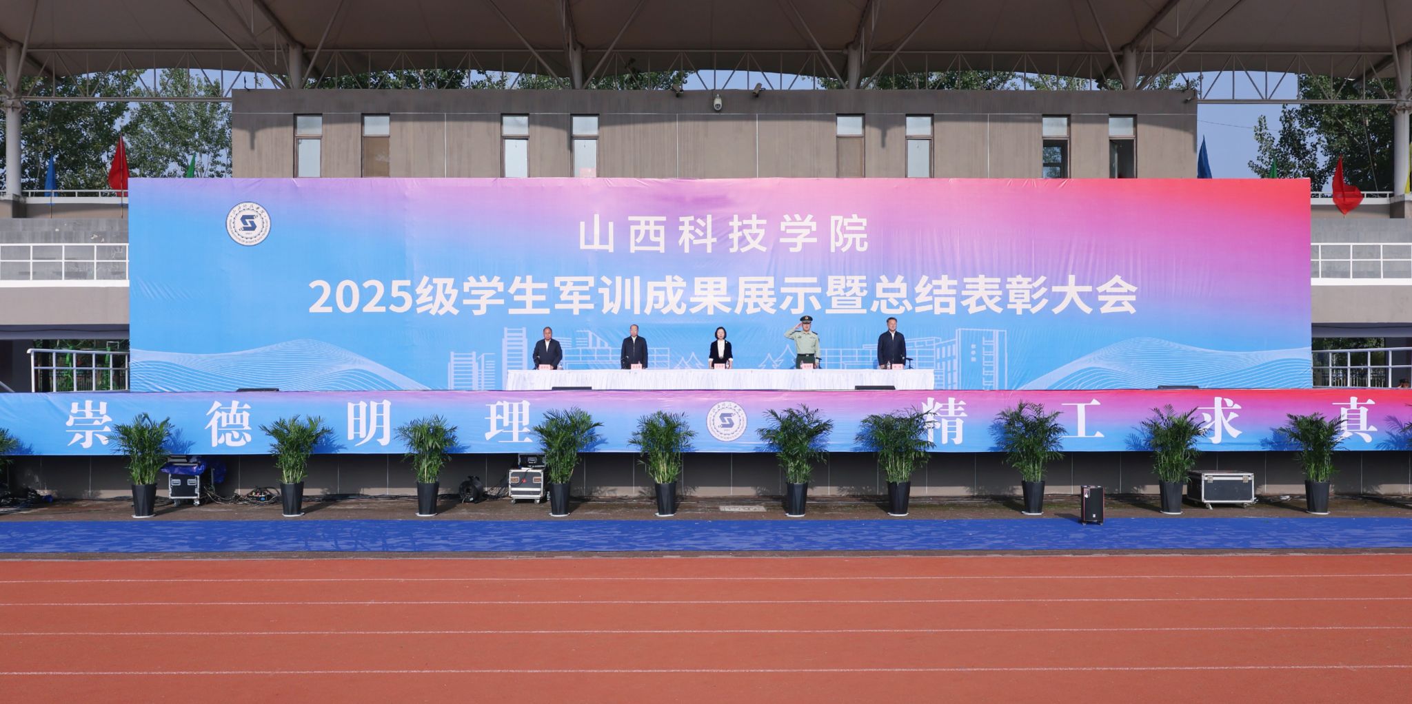 孟旭勇作承训工作总结。他指出,这次军训是一次深刻的国防教育和团队洗礼。通过军训,同学们掌握了基本的军事技能,增强了国防观念,更懂得了团结协作、顾全大局的重要性,用行动诠释了“流血流汗不流泪,掉皮掉肉不掉队”的铮铮誓言。他勉励同学们要把在军训中,尤其是在风雨考验里培养出的优良作风、顽强意志、组织纪律性和面对困难不退缩的勇气,融入到未来的学习和生活中去。以信仰为舵,铸就报国之志;以奋斗为桨,练就过硬本领;以修身为基,彰显时代新风。