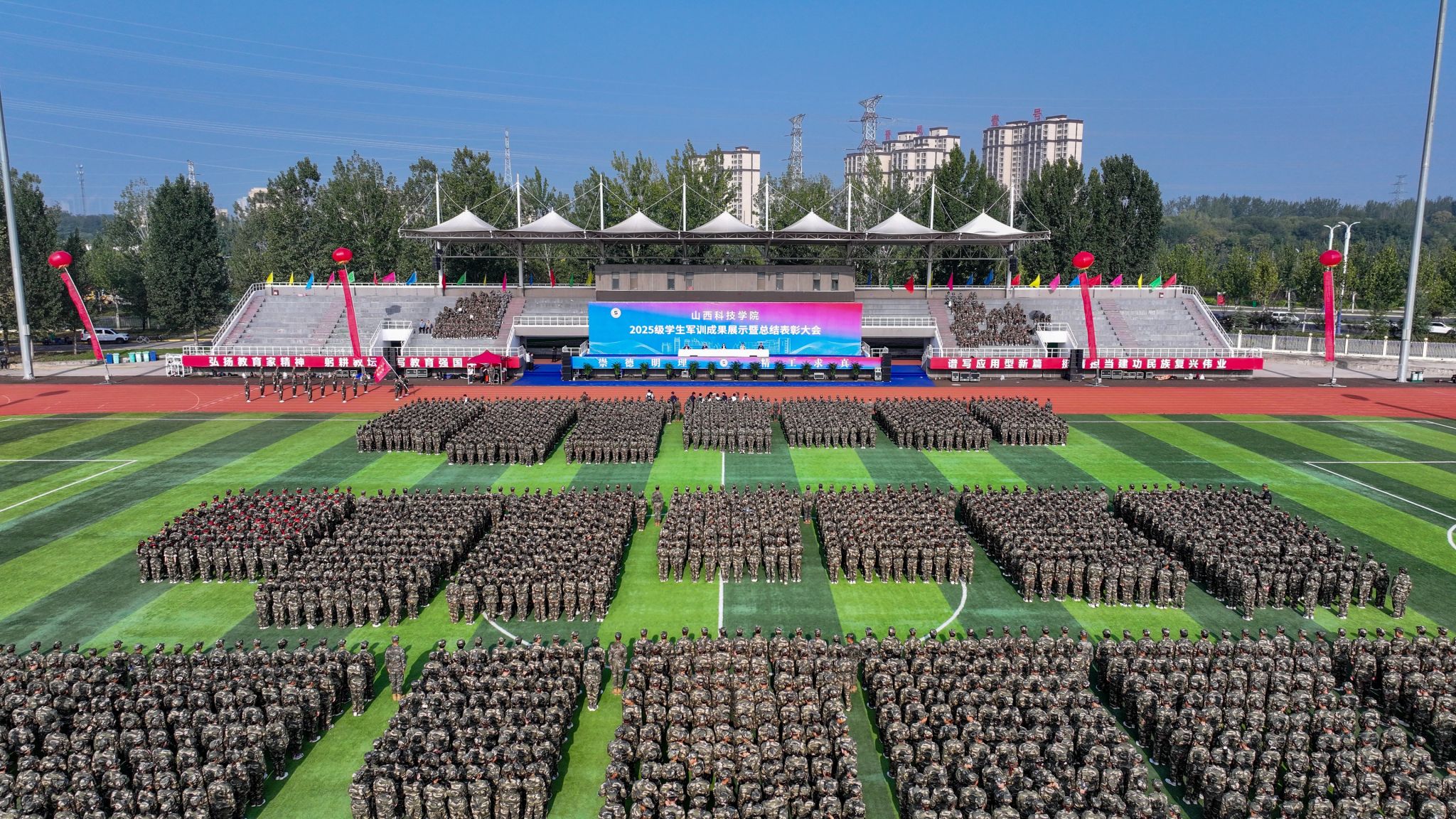 吉育峰代表学校向通过军训考验的同学们表示祝贺,向对本次军训给予大力支持的武警晋城支队及全体承训教官致以崇高的敬意。他对同学们提出四点希望。第一,传承军训作风,夯实学业根基。把站军姿的专注用到课堂听讲,把练队列的坚持用到课后复习,把迎风雨的勇气用到攻克难题,打牢专业基础,实现学业进步。第二,践行团结精神,收获真挚情谊。珍惜同学室友相处时光,包容理解、换位思考,在他人需要时伸出援手,在集体活动中积极参与。第三,坚守健康理念,锤炼强健体魄。把体育锻炼融入日常生活,以饱满精力应对学习压力、迎接人生挑战。第四,胸怀家国天下,勇担时代使命。心怀“国之大者”,在学习中锤炼本领,在实践中增长才干,努力成为有理想、敢担当、能吃苦、肯奋斗的新时代好青年。