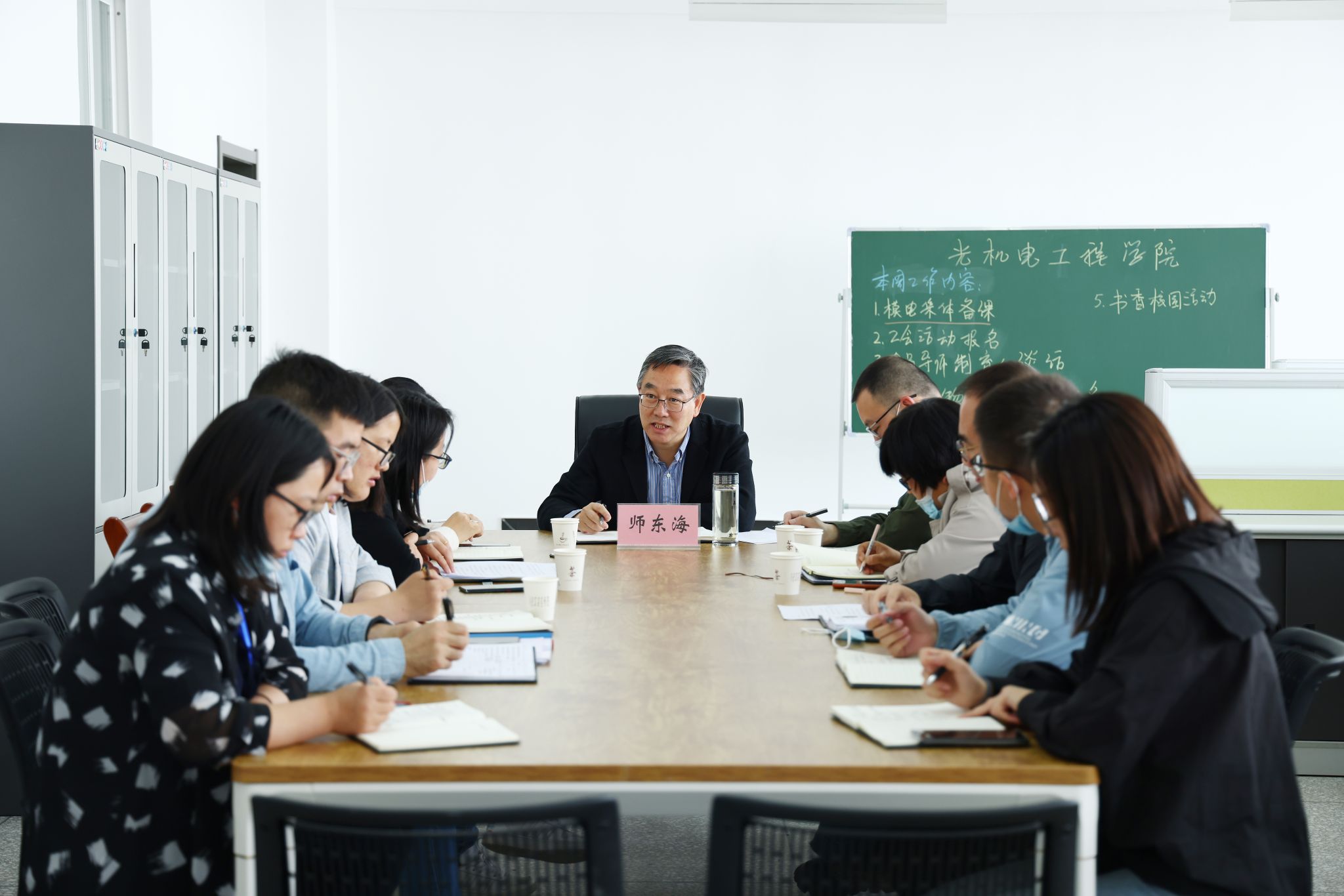 在光机电工程学院,师东海强调要充分发挥学院在光机电产业学院中的核心作用,为学校学科专业发展、服务地方经济社会、推进产教融合等方面做出示范。要深入推进校企合作、校研合作、产教融合,推动教育链、人才链与产业链、创新链的有机衔接。要聚焦晋城市光机电产业集群发展,及早谋划支撑学院发展的学科专业建设体系,以应用型人才培养为目标,面向市场,背靠学科,紧跟产业需求,打造品牌特色。要坚持开放办学的总体思路,在校企合作、产学研协同创新、科研成果转化、实验室合作共享等方面迈出新步伐,为晋城光机电产业集群发展集聚创新资源要素、营造良好人才环境,为建设光机电产业集聚城市贡献力量。