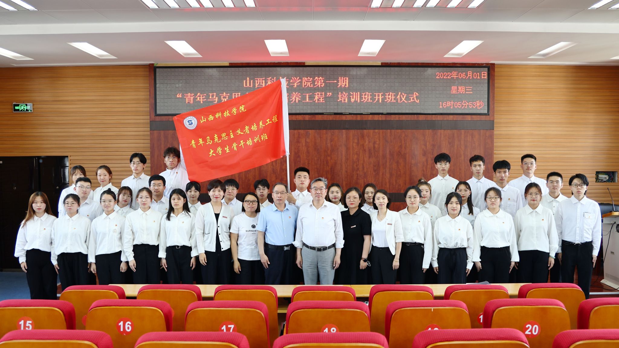 校党委书记师东海为第一期“青年马克思主义者培养工程”培训班授班旗,学员代表会计学2104团支部书记程梓昕作表态发言。