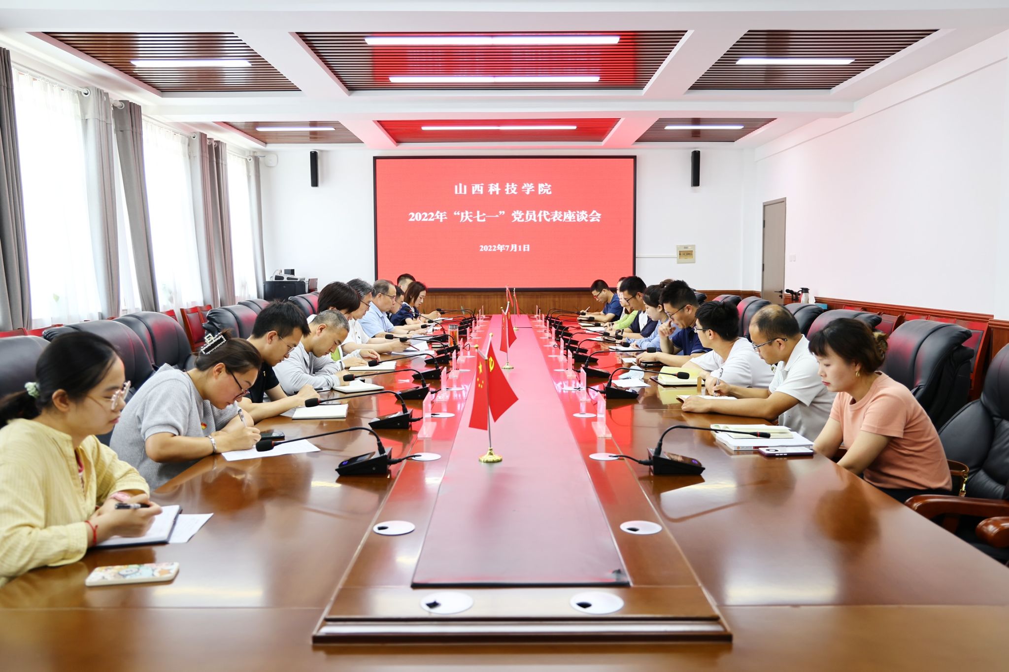 2022年7月1日是中国共产党成立101周年纪念日,Beat365官网召开“庆七一”党员代表座谈会,回顾一年来学校在党建方面取得的成绩,倾听党员的心声,激励广大党员不忘初心、担当实干,进一步发挥先锋模范作用。校党委书记师东海、党委副书记吉育峰出席会议并讲话。党支部书记代表、党员代表、新发展党员代表参加会议。会议由吉育峰主持。