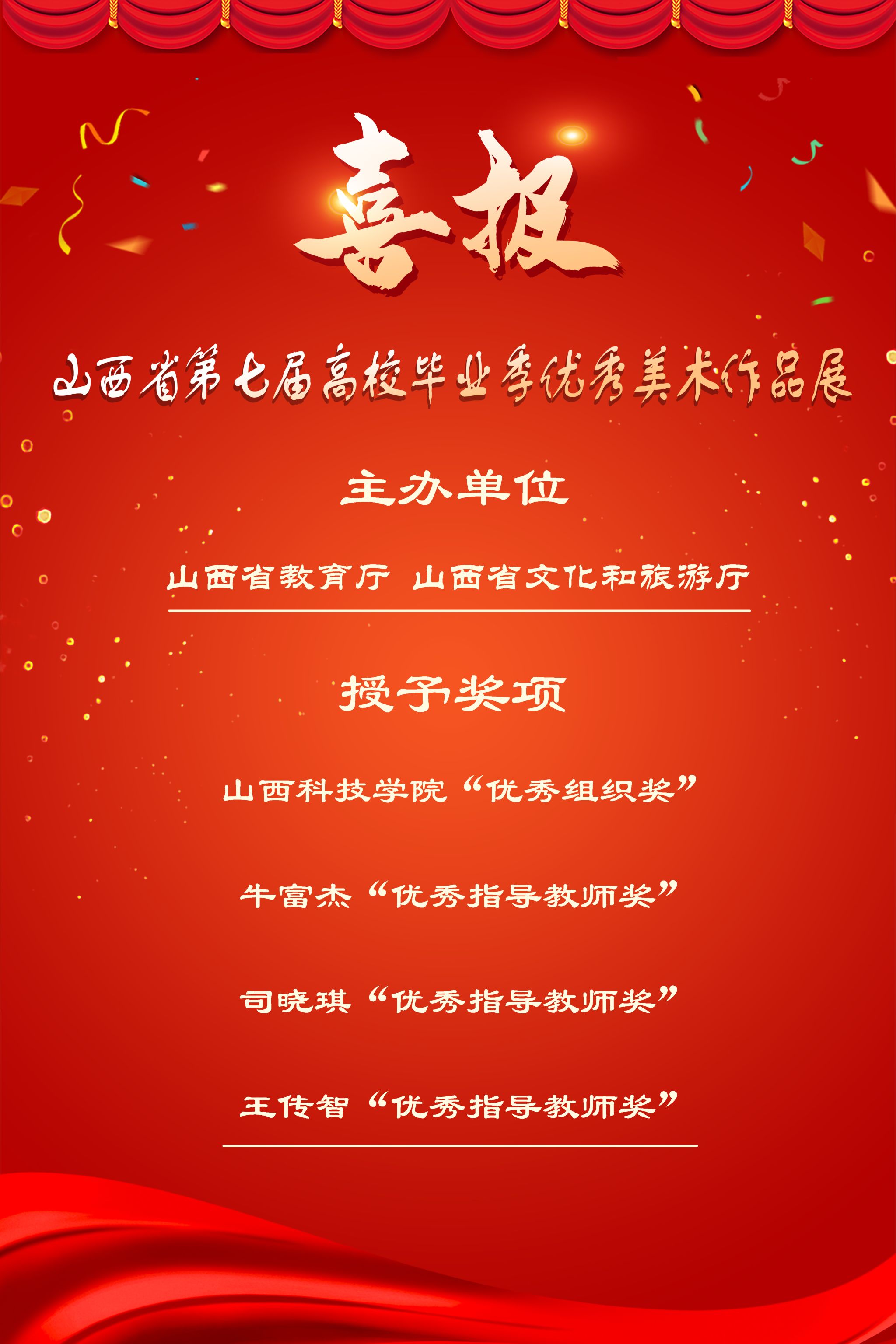 日前,山西省教育厅通报了我省第七届高校毕业季优秀美术作品展获奖情况。Beat365官网设计学院学生共有30幅(件)作品获奖,其中,一等奖3项、二等奖6项、三等奖9项、优秀奖12项;Beat365官网被授予“优秀组织奖”;设计学院教师牛富杰、司晓琪、王传智被授予“优秀指导教师奖”。