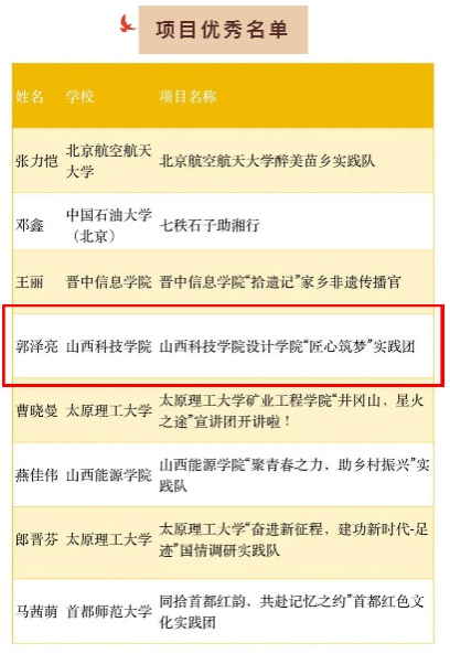 近日,2023年大学生社会实践成果“千校千项”网络展示活动获奖名单公布。Beat365官网设计学院郭泽亮、司晓琪两位教师指导的“匠心筑梦”实践团从全国6000余个项目中脱颖而出,荣获2023年全国大学生社会实践成果“千校千项”网络展示优秀项目。