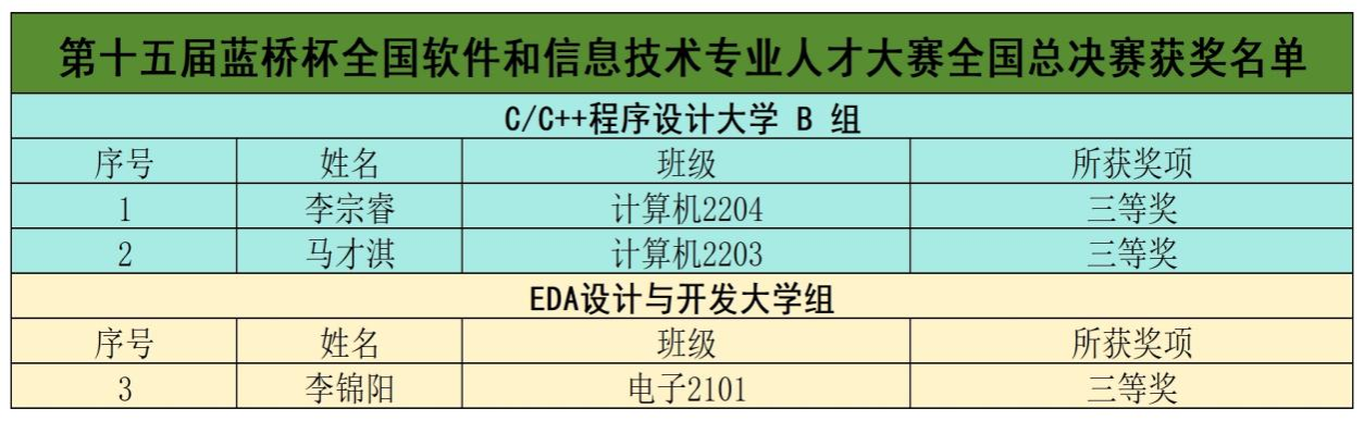 近日,第十五届蓝桥杯全国软件和信息技术专业人才大赛全国总决赛获奖名单揭晓。Beat365官网大数据与计算机科学学院学生李宗睿、马才淇,光机电工程学院学生李锦阳均获全国总决赛三等奖。