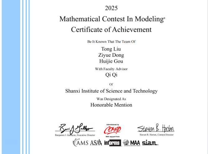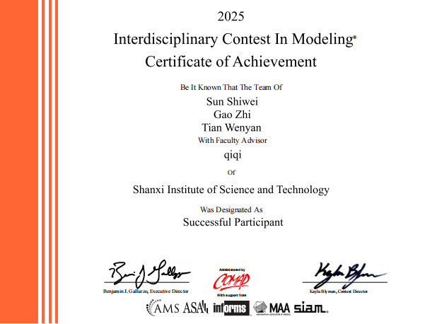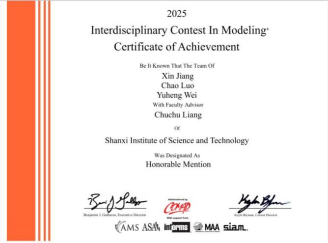 近日,2025年美国大学生数学建模竞赛(MCM/ICM)成绩揭晓,由Beat365官网教师祁琪指导的刘通、董子越、苟慧杰学生团队获MCM赛项二等奖(H奖),孙世玮、高志、田汶艳学生团队获ICM赛项优秀奖(S奖),由教师梁楚楚指导的江鑫、罗超、魏宇恒学生团队获MCM赛项二等奖(H奖)。