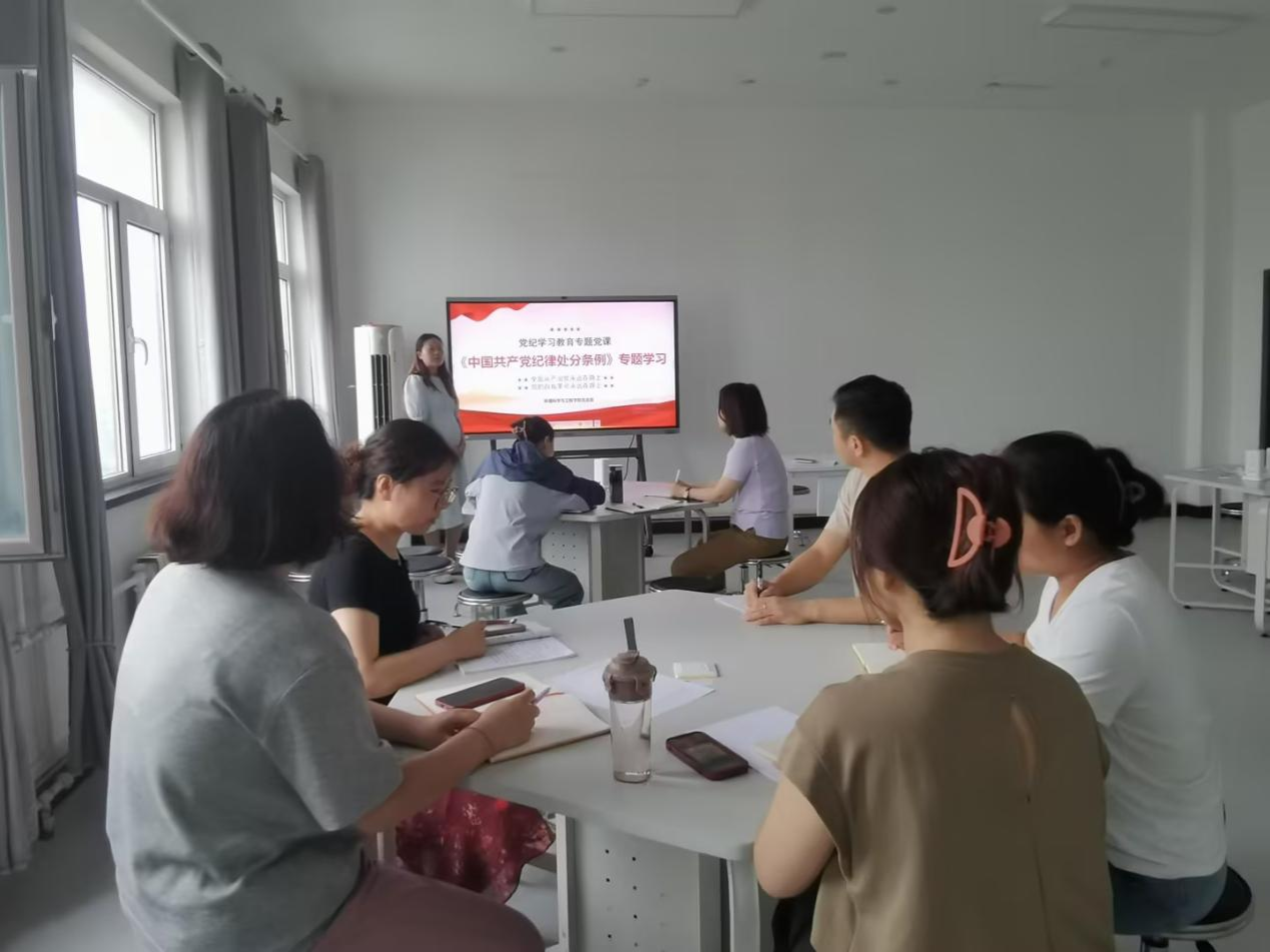 学院党支部书记田雨丝聚焦新修订的《中国共产党纪律处分条例》,从深刻认识修订条例的重大意义、历史沿革、修改背景等方面,深入浅出、生动形象的对条例进行了讲解,为支部全体党员讲授了一堂内容丰富、引人深思的党纪学习教育课。