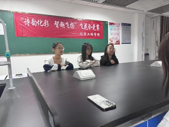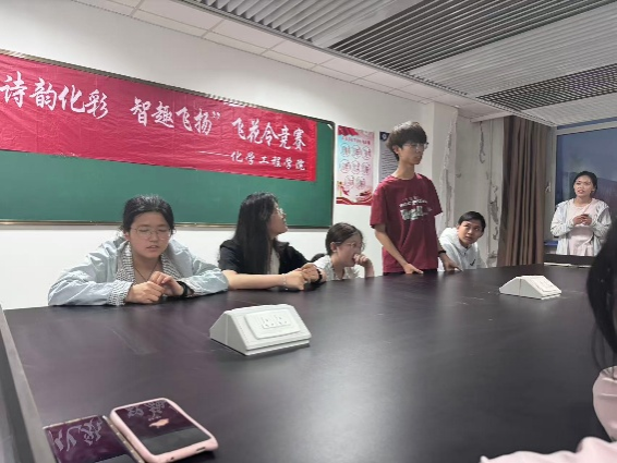 2025 年 5 月 26 日,由化学工程学院举办的“诗韵化彩,智趣飞扬”化学诗词竞赛决赛在实1-206落下帷幕,各学院积极响应。经过初赛和复赛的激烈选拔,最终有六支队伍脱颖而出晋级决赛,化学工程学院王丹丹、贺浩、张岚岚三位老师现场参与指导。