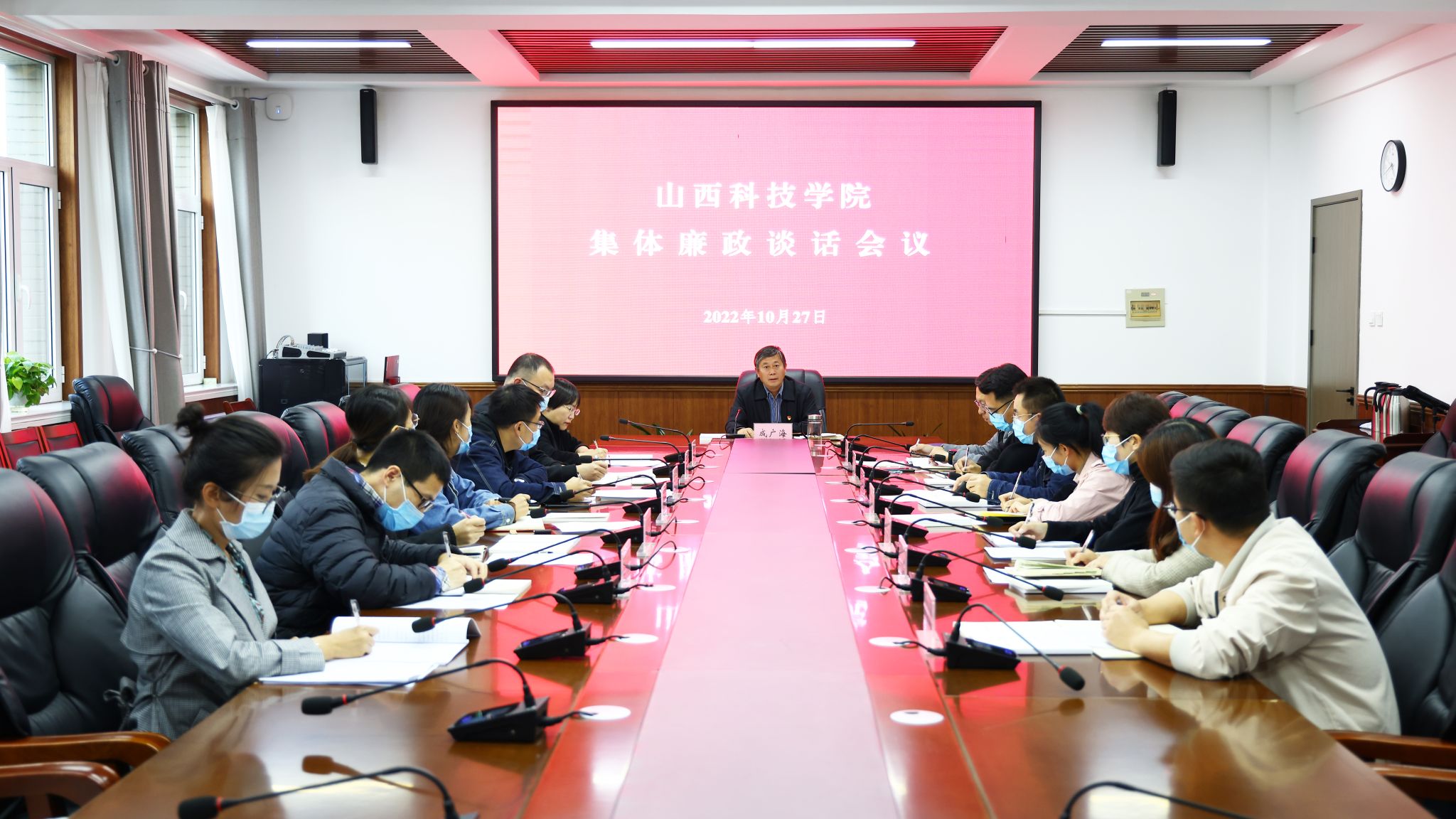 为帮助新任职干部“扣好廉洁从政‘第一粒扣子’”,深入推进全面从严治党向纵深发展和清廉山科建设,10月27日下午,校纪委对15名新任部门和学院临时负责人进行集体廉政谈话,校党委委员、纪委书记、监察专员成广海出席会议并讲话。