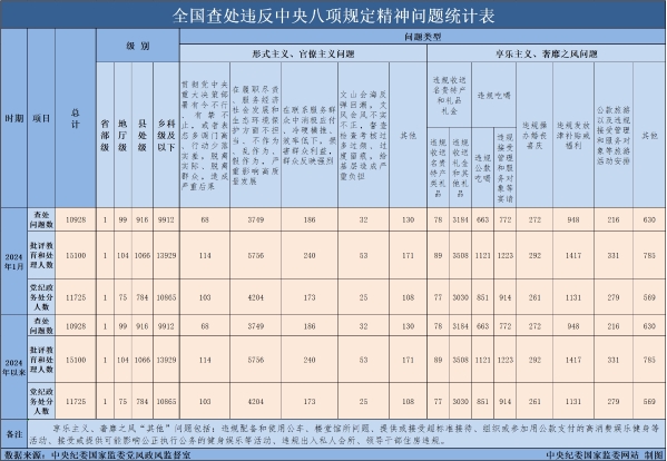 2月27日,中央纪委国家监委公布了2024年1月全国查处违反中央八项规定精神问题汇总情况。当月,全国共查处违反中央八项规定精神问题10928起,批评教育和处理15100人,其中党纪政务处分11725人,这是连续第125个月公布月报数据。