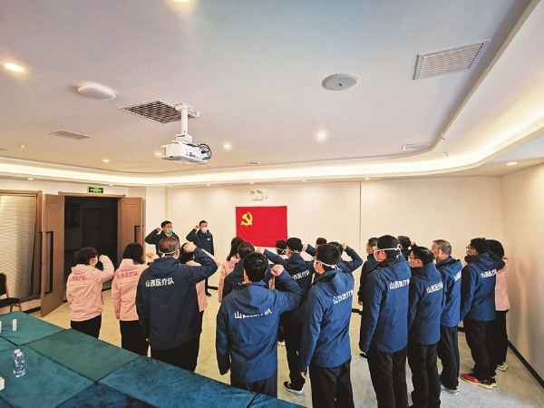 党旗召唤,灯塔指引,在山西支援湖北三市抗击疫情一线,我省支援湖北医疗队充分发挥党组织战斗堡垒作用和广大党员先锋模范作用,践行初心使命,诠释责任担当。山西日报记者袁兆辉摄