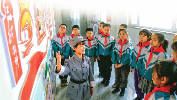 在武乡县城关小学,“小小八路”讲解员在校园内开展“党史故事会”巡讲活动,在学生中厚植爱党、爱国、爱社会主义的情感,让红色基因、革命薪火代代传承。王晓方摄