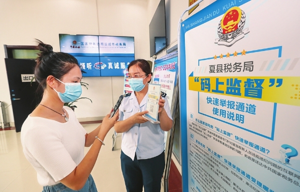 国家税务总局夏县税务局办税大厅工作人员向纳税人推广“码上监督”直通车,推动清廉理念融入基层。