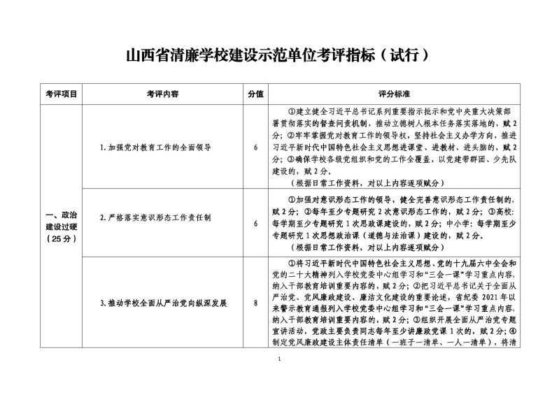 在总体把握上述基本标准的基础上,配套制定《山西省清廉学校建设示范单位考评指标》,明确细化考评内容。考评指标实行百分制。