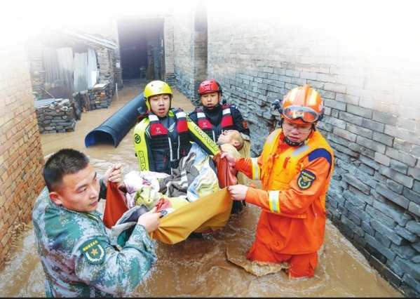 充分发挥基层党组织战斗堡垒作用和共产党员先锋模范作用,危难之际冲锋在前。图为山西省祁县党员干部在洪灾抢险一线救助受困群众。