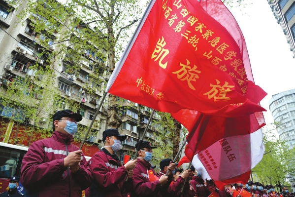 面对突如其来的新冠肺炎疫情,山西省先后派出13批1516名医护人员支援湖北,其中共产党员583名,火线入党342名。图为2020年3月,湖北省武汉市江汉区委、区政府赠授给山西国家紧急医学救援队凯旋旗。