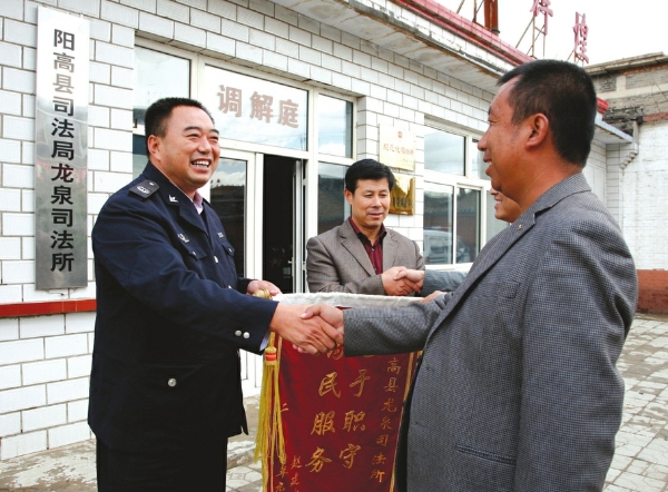 被群众誉为“李司法”的李培斌,30多年坚守基层司法调解岗位,成功调解矛盾纠纷数千起,被授予“时代楷模”称号。图为群众向李培斌赠送锦旗。