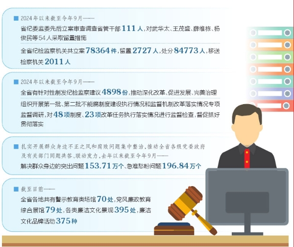 铁规发力,禁令生威。省纪委监委深化以案促改促治,发挥案件查办治本功效,深挖典型案件背后的制度缺失和监管漏洞,2024年以来截至今年9月,全省有针对性制发纪检监察建议4898份,推动深化改革、促进发展、完善治理。组织开展第一批、第二批不能腐制度建设执行情况和监督机制改革落实情况专项监督调研,推动48项制度、23项改革任务落地执行;深入推进第三批不能腐制度建设和监督机制改革,聚焦行政执法、应急管理、医疗医药、农商行系统、乡村振兴、殡葬等6个重点领域,提出19项制度建设、7项监督机制改革任务。加强对“一把手”和领导班子监督,完善权力运行制约体系。